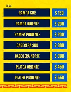 cabeceras; 450 pesos en platea oriente y en platea poniente (atrás de bancas) 550 pesos.
