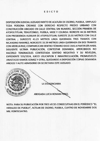 PARA SU PUBLICACIÓN POR UN DIA EN EL PERIODICO “EL HERALDO DE PUEBLA”, POR AUTO DE FECHA 28 DE JUNIO DE 2024.