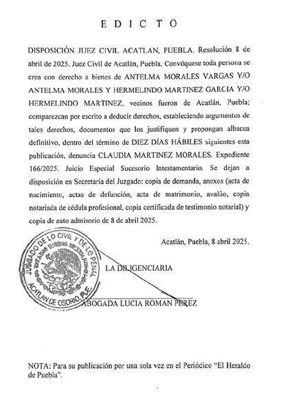 Disposición judicial de la Juez Municipal de Coronango, Puebla, Expediente Número 244/2025 Juicio de Rectificación de acta de nacimiento, promovido por JOSE INOCENTE ODILON GACHUPIN, en contra del Juez segundo del Registro del Estado Civil de las Personas de San Andrés Cholula, Puebla, córrase traslado a todas aquellas personas que tengan interés en contradecir la demanda mediante TRES EDICTOS, para que dentro del término improrrogable de TRES DIAS, contados a partir de la última publicación, contesten la demanda, apercibidos de no hacerlo dentro del término concedido, se les tendrá por contestada en sentido negativo, y se continuara con el procedimiento y sus notificaciones se harán por lista, dejando copia de traslado, anexos y auto admisorio a su disposición en secretaria. CORONANGO, PUEBLA A CINCO DE AGOSTO DE DOS MIL VEINTICINCO ABG. GUADALUPE AGUIRRE MARTINEZ C. DILIGENCIARIA ADSCRITA AL JUZGADO MUNICIPAL DE CORONANGO