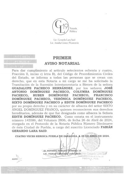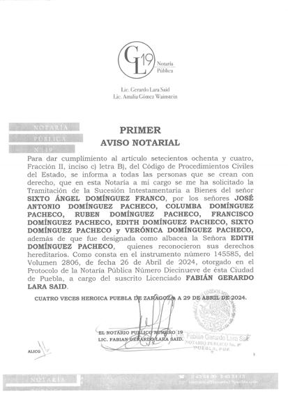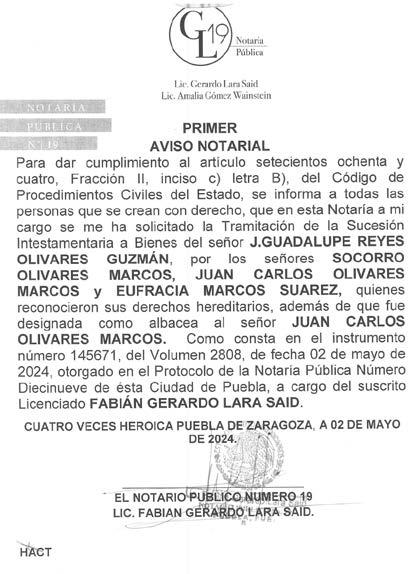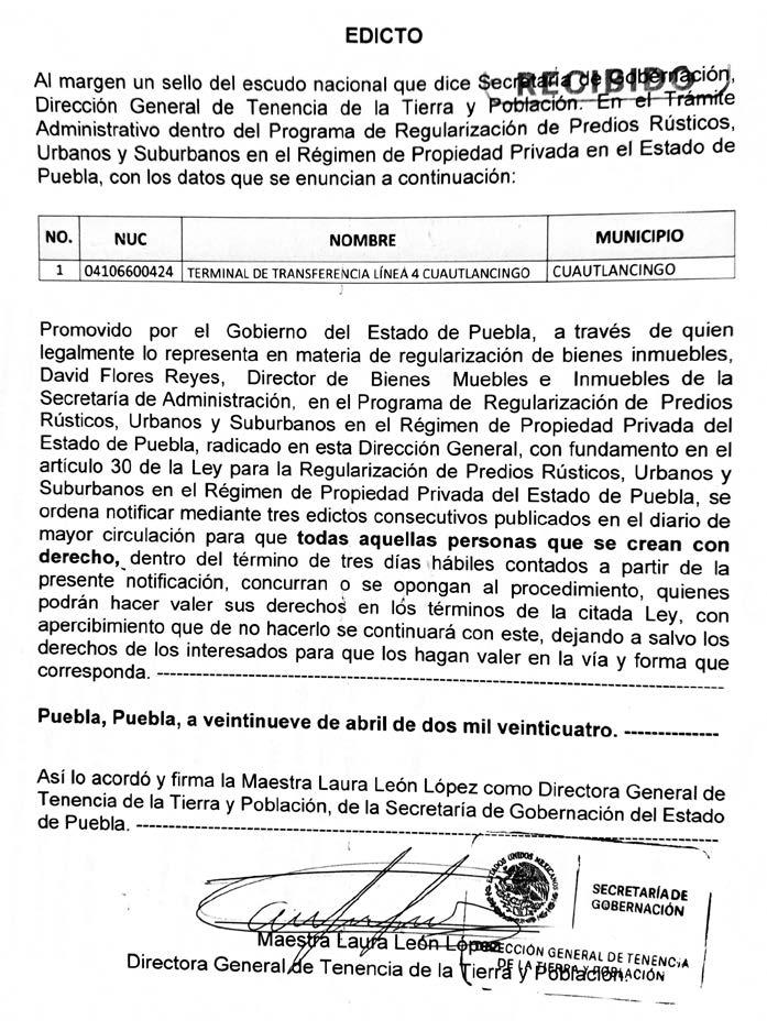 Disposición Juez Municipal de Tulcingo, Puebla; expediente 99/2024, Juicio de Rectificación de Acta de Nacimiento; promueve JULIA ALPIZAR GÁLVE, a efecto de que se asiente correctamente mí nombre: JULIA ALPIZAR GÁLVEZ, fecha de nacimiento DIECISÉIS DE FEBRERO DE MIL NOVECIENTOS SESENTA Y UNO, lugar de nacimiento CHIAUTLA DE TAPIA, PUEBLA; como nombre correcto del padre FERNANDO ALPIZAR REYNOSO, y como nombre correcto de mi madre PRODIGIOS GÁLVEZ PONCE, nombre correcto de abuelo paterno PORFIRIO ALPIZAR. Emplácesele mediante EDICTO a toda persona que pudiera tener interés en contradecir demanda para que comparezca en termino de tres días para hacer valer su derecho, de no hacerlo se tendrá por perdido su derecho, quedando en Secretaria del Juzgado copias de la demanda, anexos y auto de admisión para que se impongan de la misma. Tulcingo, Puebla; tres de mayo de dos mil veinticuatro. Diligenciaria Abogada Darinca Guzmán Reyes