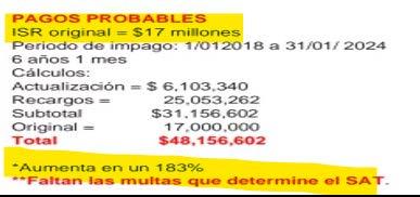 A ese monto se debe adicionar las siguientes contribuciones omitidas: Impuesto estatal sobre nóminas (Coahuila / 2017 = 2%), cuotas de INFONAVIT, IMSS, AFORE, multas, recargos y actualizaciones sobre esos 17 millones y sobre los conceptos anteriores. Sería mucho más que el monto detectado. Solo del monto principal ya suma casi 50 millones de pesos, con el resto de los rubros la cifra puede superar fácilmente los 100 millones de pesos si fuera declarado culpable.