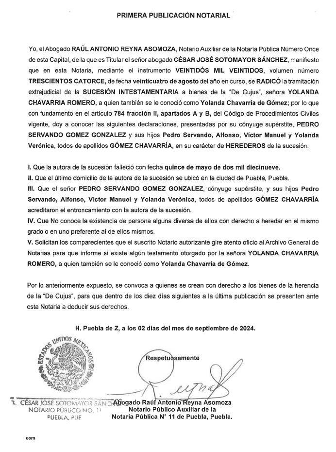 DISPOSICIÓN JUDICIAL. Juez Municipal de San Jerónimo Xayacatlán, Puebla. Resolución 02 septiembre 2024. Se ordena emplazar todo interesado en contradecir demanda Juicio Rectificación Acta de Nacimiento, aparecen, fecha de nacimiento, lugar de Nacimiento; nombre de padre, y validar acta de nacimiento porque no aparece sello: “A LAS QUINCE HORAS DE LA MAÑANA DEL DIA 15 QUINCE DE AGOSTO O SEA DEL MES PRESENTE”; “EN SU CASA Y HABITACIÓN NÚMERO 42 CUARENTA Y DOS. UBICADO EN BARRANCA SALADA DE ESTA JURISDICCIÓN”; “BALERIANO SÁNCHEZ GÓMEZ”; para quedar como “QUINCE DE AGOSTO DE MIL NOVECIETOS SESENTA Y UNO”; “SAN JERÓNIMO XAYACATLÁN, PUEBLA” Y “VALERIANO SÁNCHEZ GÓMEZ. Comparezca hacer valer su derecho término TRES DIAS hábiles siguientes esta publicación, señale domicilio notificaciones; no hacerlo tendráse por perdido su derecho, notificaciones lista. Expediente 156/2024, promueve ARNULFA SÁNCHEZ ROSALES. Copias demanda, anexos, auto admisorio, disposición Secretaría del Juzgado. San Jerónimo Xayacatlán, Puebla, 02 de septiembre de 2024. EL DILIGENCIARIO LIC. JORGE PEDRO GONZÁLEZ ARIZA NOTA: Para su publicación una vez en el Periódico “El Heraldo”.