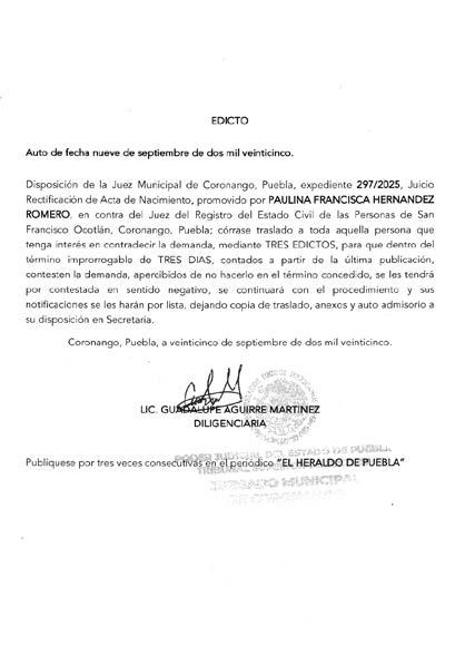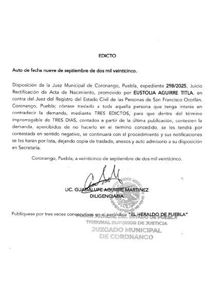 Disposición de la Jueza Municipal de Coronango, Puebla, por auto de fecha diecisiete de septiembre de dos mil veinticinco, dentro del expediente número 307/2025, juicio de rectificación de acta de nacimiento, promovido por VICTORIA AQUINO LOZANO, en contra de la Oficialía del Registro Civil de Martínez de la Torre, Veracruz, córrase traslado a toda aquella persona que tengan interés en contradecir la demanda, mediante TRES EDICTOS, para que dentro de del término improrrogable de TRES DÍAS contados a partir de la última publicación, contesten la demanda, apercibidos de no hacerlo en el término concedido, se les tendrá por contestada en sentido negativo, se continuara con el procedimiento y sus notificaciones se les hará por lista, dejando copia traslado, anexos y auto admisorio a su disposición en secretaria. Coronango, Puebla; a seis de octubre de dos mil veinticinco. DILIGENCIARIA