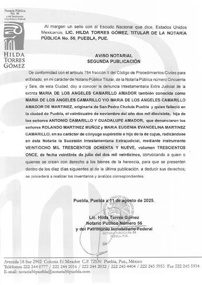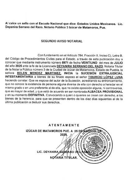 A CABO EL INICIO DE LA TRAMITACIÓN EXTRAJUDICIAL DE LA SUCESIÓN INTESTAMENTARIA A BIENES DE ELIO GAMBINO OLTEHUA, QUE FORMULAN LOS SEÑORES AURELIA GONZÁLEZ ANTONIO, LIDIA GAMBINO MONTALVO, ROSALBA YESSENIA GAMBINO GONZÁLEZ, LILIANA YADIRA GAMBINO GONZÁLEZ y LUIS ENRIQUE GAMBINO GONZÁLEZ, LA PRIMERA EN SU CARÁCTER DE CÓNYUGE SUPÉRSTITE Y LOS SIGUIENTES EN SU CARÁCTER DE DESCENDIENTES DIRECTOS, RECONOCIENDO: A).- QUE LOS COMPARECIENTES NO CONOCEN DE LA EXISTENCIA DE PERSONA ALGUNA DIVERSA DE ELLOS CON DERECHO A HEREDAR EN EL MISMO GRADO O EN UNO PREFERENTE AL DE ELLOS MISMOS. B).- LOS DERECHOS HEREDITARIOS DE ESTA SUCESIÓN. C).-QUE EN VIRTUD DEL INFORME EXPEDIDO POR LA DIRECCIÓN DEL ARCHIVO DE NOTARIAS DE ESTADO DE PUEBLA CON NÚMERO DE OFICIO CJGE/DGN/DAN/VD/1137/2025, DE FECHA SEIS DE JUNIO DEL AÑO DOS MIL VEINTICINCO, NO SE ENCONTRÓ DISPOSICIÓN TESTAMENTARIA ALGUNA HECHA POR EL EXTINTO. LO ANTERIOR A EFECTO DE CONVOCAR A QUIEN O QUIENES SE CREAN CON DERECHO A LOS BIENES DE LA HERENCIA, PARA QUE SE PRESENTEN DENTRO DE LOS DIEZ DÍAS SIGUIENTES AL DE LA ÚLTIMA PUBLICACIÓN, A DEDUCIR SUS DERECHOS. ATENTAMENTE SUFRAGIO EFECTIVO NO REELECCIÓN. TEHUACÁN, PUEBLA, A 29 DE JULIO DE 2025. TITULAR DE LA NOTARIA PÚBLICA NUMERO SIETE. LIC. JOSÉ LUIS SALGADO VÁZQUEZ. Para su publicación por dos veces en un término de diez días en el Periódico “El Heraldo de Puebla”