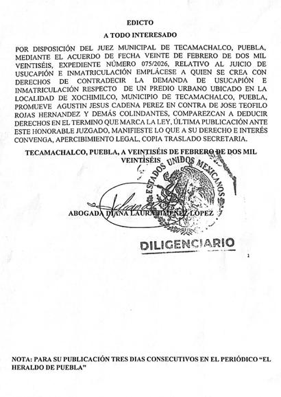 EDICTO DISPOSICIÓN DEL JUEZ MUNICIPAL DE PETLALCINGO, PUEBLA; expediente 106/2026, Juicio Especial de Rectificación de Acta de Nacimiento; promueve MARÍA DE JESÚS MERINO BENITEZ, a efecto de que se asiente correctamente mí nombre: MARÍA DE JESÚS MERINO BENITEZ, fecha de nacimiento DOS DE JUNIO DE MIL NOVECIENTOS SETENTA Y OCHO, lugar de nacimiento AXUTLA, PUEBLA; como nombre correcto del padre FACUNDO MERINO RIVERA, como nombre correcto de mi madre SOCORRO BENÍTEZ DE DIOS, y COMO VÁLIDA MI ACTA DE NACIMIENTO. Auto de fecha veinte de febrero de dos mil veintiséis, emplácesele mediante EDICTO a toda persona que pudiera tener interés en contradecir demanda para que comparezca en termino de tres días para hacer valer su derecho, de no hacerlo se tendrá por perdido su derecho, quedando en Secretaria del Juzgado copias de la demanda, anexos y auto de admisión para que se impongan de la misma. Petlalcingo, Puebla; veintiséis de febrero de dos mil veintiséis.