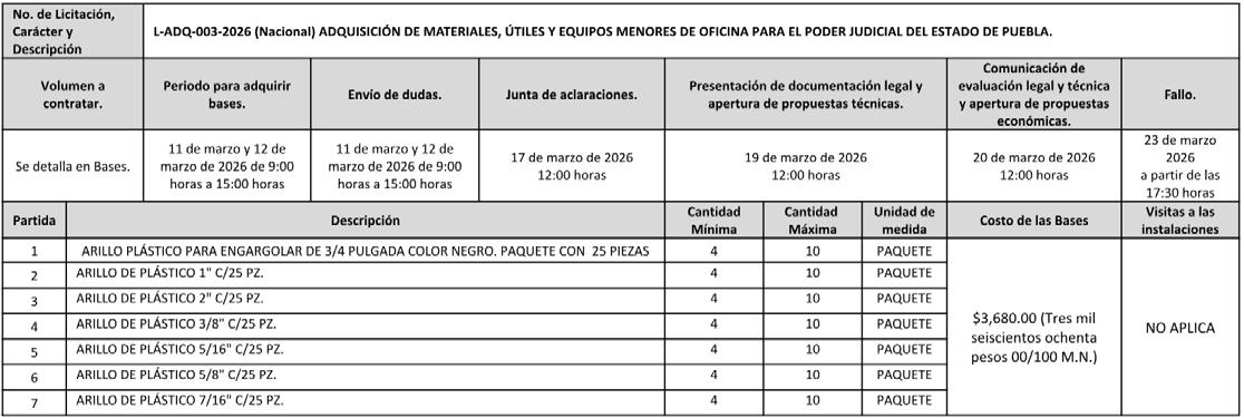La Secretaría de Administración del Consejo de la Judicatura del Poder Judicial del Estado de Puebla a través de la Dirección de Adquisiciones y Adjudicaciones, en observancia de los artículos 108 de la Constitución Política del Estado Libre y Soberano de Puebla, así como 76 y 82 fracción XXIX y demás que resulten aplicables de la Ley Orgánica del Poder Judicial del Estado de Puebla; y de acuerdo a los artículos 4, 15 fracción I, 16, 78, 79, 82, 108 y demás relativos aplicables de la Ley de Adquisiciones, Arrendamientos y Servicios del Sector Público Estatal y Municipal, en concordancia con lo dispuesto por el artículo 34 fracción II, VII y 55 fracciones III y IV del Reglamento Interior del Consejo de la Judicatura del Poder Judicial del Estado de Puebla, convoca a presentar libremente proposiciones solventes en idioma español en tres sobres cerrados en tiempo y lugar de entrega según bases, a las personas físicas o morales, de nacionalidad mexicana, en la licitación pública, cuyas bases contienen los requisitos de participación, los interesados podrán revisar las bases en la página de Internet https://www. pjpuebla.gob.mx/licitaciones#close previamente a su pago, el cual será requisito para participar en las licitaciones; el procedimiento L-ADQ-003-2026 se llevará a cabo a tiempos cortos de conformidad con el segundo párrafo del artículo 82 de la Ley de Adquisiciones, Arrendamientos y Servicios del Sector Público Estatal y Municipal.