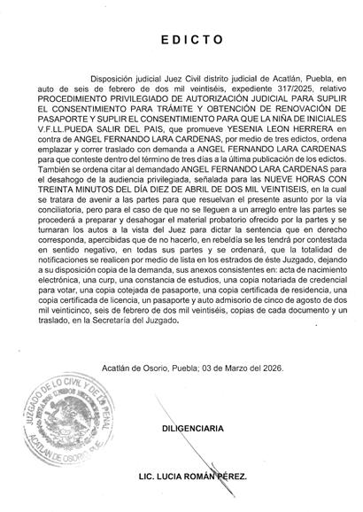 EDICTO DISPOSICIÓN DEL JUEZ MUNICIPAL DE PETLALCINGO, PUEBLA; expediente 103/2026, Juicio Especial de Rectificación de Acta de Nacimiento; promueve ANA MARÍA DURÁN CHÁVEZ, a efecto de que se asiente correctamente mí nombre: ANA MARÍA DURÁN CHÁVEZ, fecha de nacimiento OCHO DE ABRIL DE MIL NOVECIENTOS SETENTA Y TRES, lugar de nacimiento SANTO DOMINGO TONAHUIXTLA, SAN JERÓNIMO XAYACATLÁN, PUEBLA; como nombre correcto del padre FÉLIX DURÁN DE JESÚS, como nombre correcto de mi madre MARÍA DE LA PAZ CHÁVEZ MORALES, NÚMERO DE ACTA 25 VEINTICINCO y COMO VÁLIDA MI ACTA DE NACIMIENTO. Auto de fecha veinte de febrero de dos mil veintiséis, emplácesele mediante EDICTO a toda persona que pudiera tener interés en contradecir demanda para que comparezca en termino de tres días para hacer valer su derecho, de no hacerlo se tendrá por perdido su derecho, quedando en Secretaria del Juzgado copias de la demanda, anexos y auto de admisión para que se impongan de la misma. Petlalcingo, Puebla; veintiséis de febrero de dos mil veintiséis.