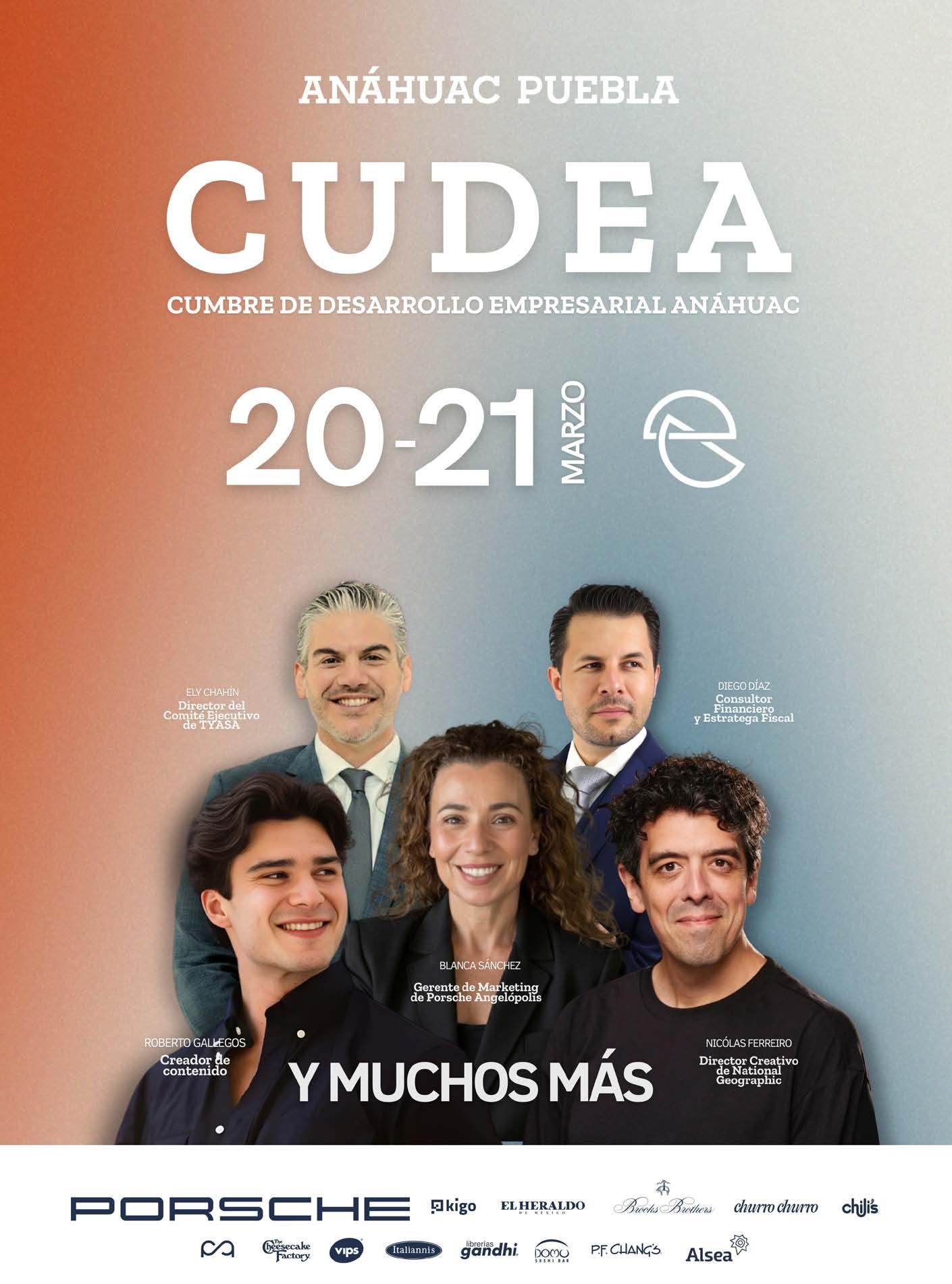 Los días 20 y 21 de marzo, la Universidad Anáhuac Puebla llevará a cabo la tercera edición de CUDEA (Cumbre de Desarrollo Empresarial Anáhuac), con la participación de ponentes del ámbito empresarial, político y liderazgo.