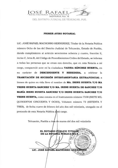 EDICTO DISPOSICIÓN DEL JUEZ MUNICIPAL DE PETLALCINGO, PUEBLA; expediente 107/2026, Juicio Especial de Rectificación de Acta de Nacimiento; promueve MARGARITA CRUZ CADENA, a efecto de que se asiente correctamente mí nombre: MARGARITA CRUZ CADENA, fecha de nacimiento DIEZ DE JUNIO DE MIL NOVECIENTOS SESENTA Y OCHO, lugar de nacimiento NORIA HIDALGO, TEHUITZINGO, PUEBLA; como nombre correcto del padre EMILIO CRUZ TRINIDAD, presentada VIVA, sexo FEMENINO. Auto de fecha veinte de febrero de dos mil veintiséis, emplácesele mediante EDICTO a toda persona que pudiera tener interés en contradecir demanda para que comparezca en termino de tres días para hacer valer su derecho, de no hacerlo se tendrá por perdido su derecho, quedando en Secretaria del Juzgado copias de la demanda, anexos y auto de admisión para que se impongan de la misma. Petlalcingo, Puebla; veintiséis de febrero de dos mil veintiséis. ABOGADA ERIKA ROSALBA HERNÁNDEZ SARABIA DILIGENCIARIA DEL JUZGADO MUNICIPAL DE PETLALCINGO, PUEBLA.