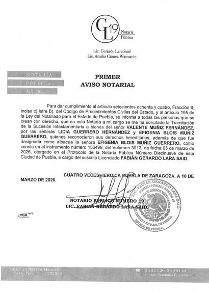 EDICTO DISPOSICIÓN DEL JUEZ MUNICIPAL DE PETLALCINGO, PUEBLA; expediente 109/2026, Juicio Especial de Rectificación de Acta de Nacimiento; promueve ELODIA DOMINGUEZ EVANGELISTA, a efecto de que se asiente correctamente mí nombre: ELODIA DOMINGUEZ EVANGELISTA, fecha de nacimiento VEINTIDÓS DE OCTUBRE DE MIL NOVECIENTOS SETENTA Y CINCO, lugar de nacimiento XAYACATLÁN DE BRAVO, PUEBLA; como nombre correcto de mi madre AGRIPINA LUCINA EVANGELISTA HERNÁNDEZ. Auto de fecha veinte de febrero de dos mil veintiséis, emplácesele mediante EDICTO a toda persona que pudiera tener interés en contradecir demanda para que comparezca en termino de tres días para hacer valer su derecho, de no hacerlo se tendrá por perdido su derecho, quedando en Secretaria del Juzgado copias de la demanda, anexos y auto de admisión para que se impongan de la misma. Petlalcingo, Puebla; veintiséis de febrero de dos mil veintiséis.