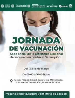 REDACCIÓN. Como parte de las estrategias de salud y como medida preventiva ante brotes de sarampión, el Gobierno Municipal de San Martín Texmelucan que preside Juan Manuel Alonso Ramírez, en coordinación con el IMSS y con la empresa Rassini Frenos invitan a la población a participar en la Jornada de Vacunación. FOTO: ESPECIAL
