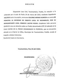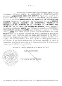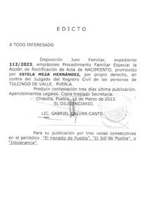 A TODO INTERESADO Disposición judicial de fecha de ocho de octubre de dos mil veintiuno, Juez Municipal de Acatlán de Osorio, Puebla. Expediente 376/2021, dese vista del juicio de RECTIFICACIÓN DE ACTA DE NACIMIENTO, A TODO AQUEL QUE PUDIERA TENER INTERES EN CONTRADECIR LA DEMANDA, PROMUEVE: NOEMI COHETERO SORIANO, contra el Juez del Registro Civil de Hermenegildo Galeana, Acatlán, Puebla, Asiente los datos correctos ya que asentaron de forma errónea mi nombre U NOEMI COHETERO SORIANO (REMARCADO), siendo lo correcto NOEMI COHETERO SORIANO, mi fecha de nacimiento DIA 19 DE JUNIO DE 1985 (REMARCADO) siendo lo correcto DIECINUEVE DE JUNIO DE MIL NOVECIENTOS OCHENTA Y CINCO, mi lugar de nacimiento se asentó HERMENGILDO GALENA, ACATLAN, PUEBLA (REMARCADO), siendo lo correcto HERMENEGILDO GALEANA, ACATLAN, PUEBLA, el nombre de mi progenitor se asentó como LEOBARDO COHETERO ROSAS (REMARCADO), siendo lo correcto CELSO LEOBARDO COHETERO ROSAS; número de acta 60 (remarcado) siendo lo correcto acta numero 60 sesenta; de igual manera su fecha de registro 16 DE AGOSTO DE 1985, siendo lo correcto 16 DE AGOSTO DE 1985. Producir contestación tres días siguientes a su publicación. Copia traslado y auto admisorio a su disposición en secretaria Civil del Juzgado. C. DILIGENCIARÍO LIC. ERNESTO JIMENEZ SANTIAGO En el periódico “EL HERALDO DE PUEBLA” para su publicación por UN DIA; Calle 15 Oriente número 422 Interior 1 Col. El Carmen; CP 72530 Puebla, Pue