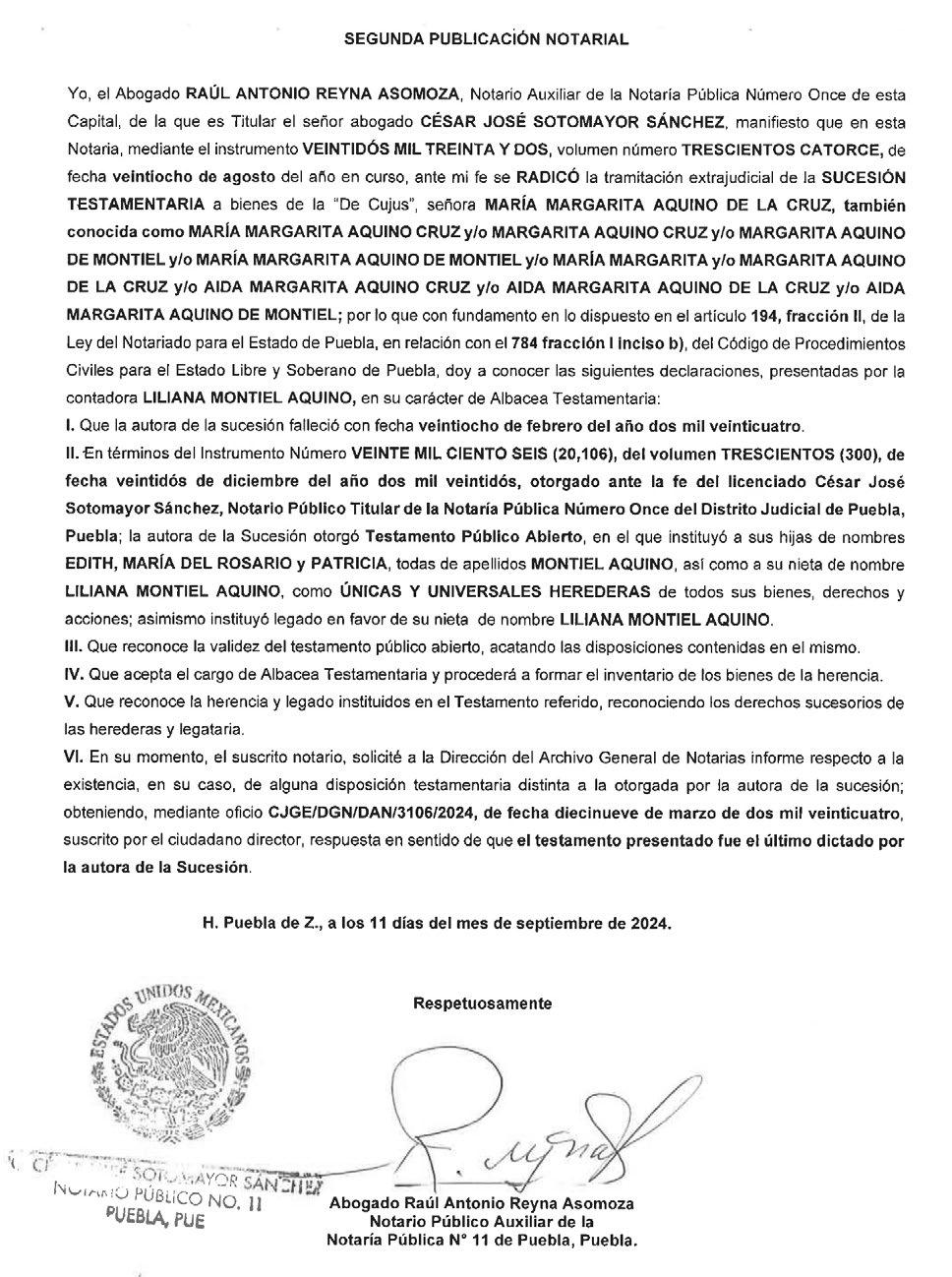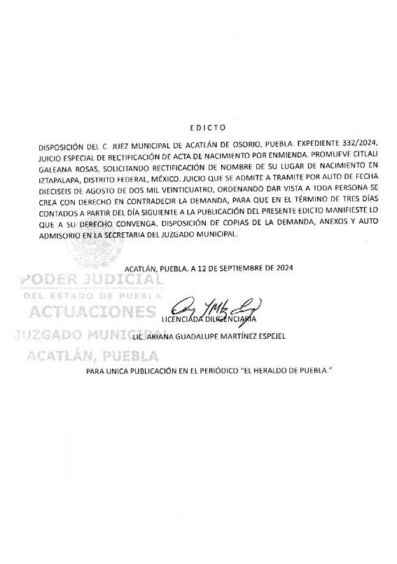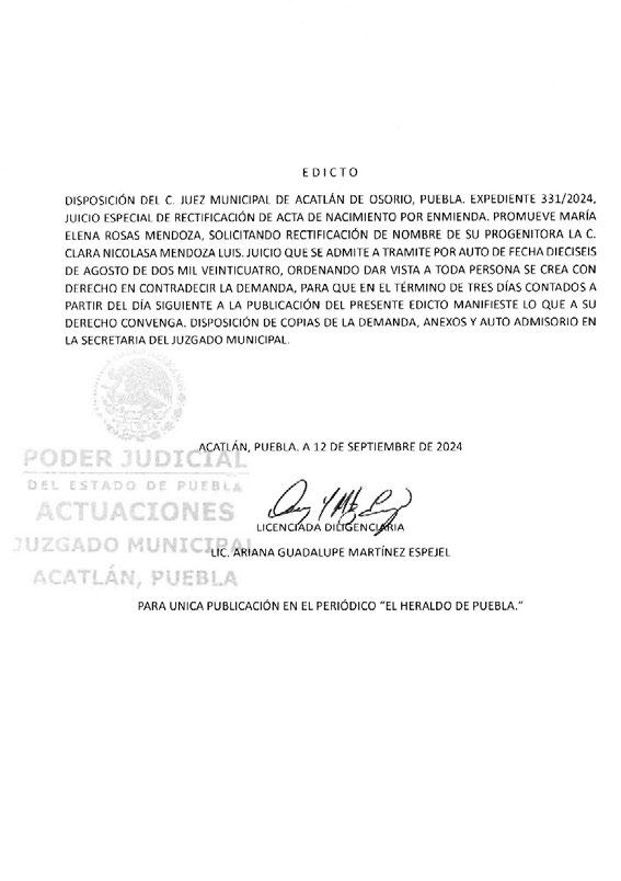 ANTERIOR, MI LUGAR DE NACIMIENTO: EN SU CASA HABITACIÓN, EL NOMBRE DE MI PADRE DE: REGULO CORTEZ COHETERO Y EL NOMBRE DE MI MADRE COMO: FILADELFA VELASCO, FALTANDO ASENTAR EL APELLIDO MATERNO DE MI MADRE; PARA QUEDAR COMO: MI NOMBRE CORRECTO DE: EDELMIRA CORTES VELASCO, MI FECHA DE NACIMIENTO: 24 VEINTICUATRO DE JUNIO DE 1962 MIL NOVECIENTOS SESENTA Y DOS, CON LUGAR DE NACIMIENTO: ACATLÁN DE OSORIO, ACATLÁN, PUEBLA, EL NOMBRE DE MI PADRE DE: REGULO CORTES COHETERO Y EL NOMBRE DE MI MADRE COMO: FILADELFA VELASCO GARCIA; PRODUCIR CONTESTACIÓN DENTRO DEL TERMINO DE TRES DIAS SIGUIENTES A ESTA PUBLICACIÓN, BAJO APERCIBIMIENTOS LEGALES, QUEDANDO EN SECRETARIA DE ESTE JUZGADO, COPIAS DE LA DEMANDA, SUS ANEXOS Y AUTO ADMISORIO. ACATLAN DE OSORIO, ACATLÁN, PUEBLA, A 11 DE SEPTIEMBRE DE 2024. EL DILIGENCIARIO. LIC. ARIANA GUADALUPE MARTINEZ ESPEJEL.