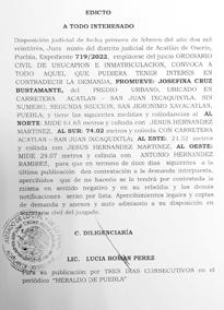 DISPOSICION JUDICIAL, Resolución 2 de diciembre 2022, ordena emplazar TODO AQUEL QUE SE CREA CON DERECHO al inmueble ¨LA PRIMERA TERCERA PARTE DEL TERRENO DE TEMPORAL CON PARTE DE CAMPO ALTO SITO EN CAÑADA DE TETLA¨, Correspondiente al municipio de Piaxtla, Puebla; siguientes medidas y colindancias: norte 122.10 metros con Camino Real (antes Ajal que conduce a Rancho de Tetla); sur 323 metros con Maria Garcia Molina (antes Simon y Fortino Aquino); oriente 155.00 metros con Luis Zurita Carrera; Poniente 255.00 metros con Herminio Bello Rincon (antes Ajal Que conduce a Rancho de Tetla). Comparezcan contestar demanda Término DOCE DÍAS siguientes última publicación, no hacerlo tendráse Contestada negativamente y en rebeldía. Juicio usucapión, expediente 512/2022, promueve José Aquino Navarrete Copias traslado Diligenciaria. Acatlán, Puebla, diciembre 2 de 2022.