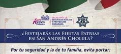 • EL AYUNTAMIENTO DE SAN ANDRÉS CHOLULA ACTIVÓ EL OPERATIVO “FIESTAS PATRIAS 2025” PARA GARANTIZAR ENTORNOS SEGUROS LOS DÍAS 15 Y 16 DE SEPTIEMBRE. HABRÁ VIGILANCIA EN EL ZÓCALO Y JUNTAS AUXILIARES, OPERATIVOS VIALES Y SUPERVISIÓN EN ZONAS DE PIROTECNIA.