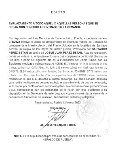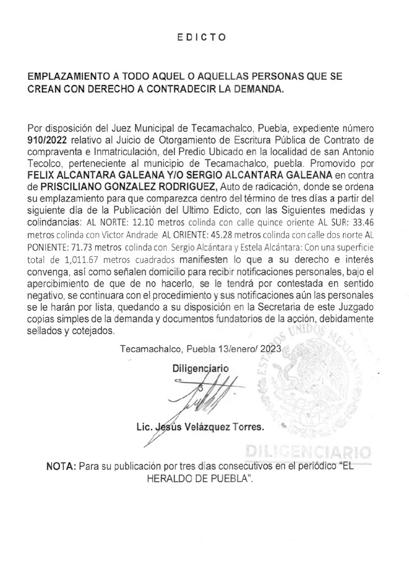 San Jerónimo Xayacatlán, Puebla, a 03 enero del 2023, DILIGENCIARIO LIC. JORGE PEDRO GONZALEZ ARIZA Nota: para su publicación en una sola vez en el periódico “EL HERALDO DE PUEBLA”