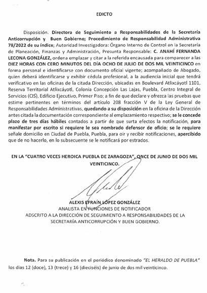 C. DILIGENCIARIO JOSE LUIS AGUILAR CRUZ Para su publicación por una sola vez en el periódico El Heraldo de Puebla.