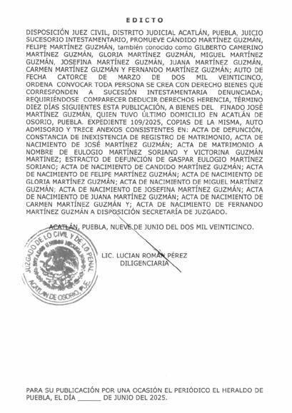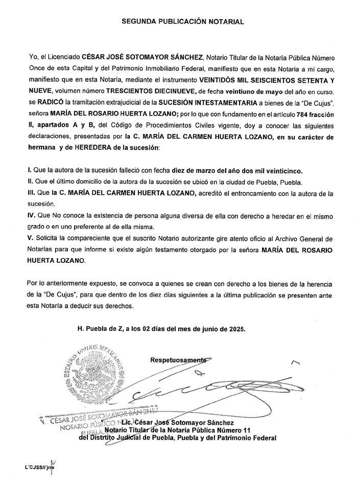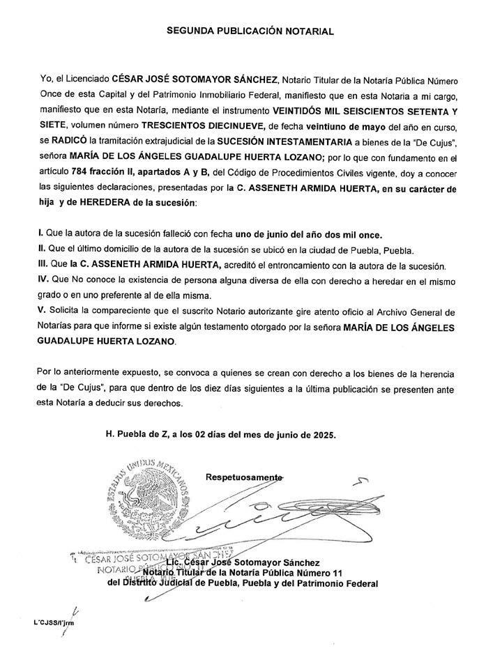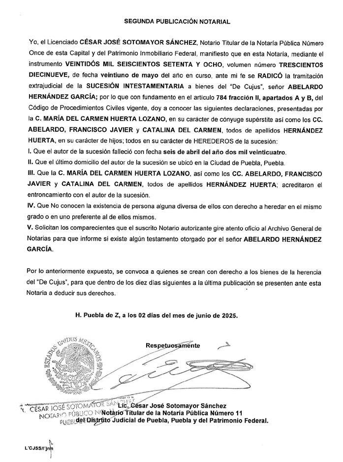 AVISO NOTARIAL DE CONFORMIDAD CON EL ARTICULO 784 DEL CÓDIGO DE PROCEDIMIENTOS CIVILES PARA EL ESTADO, EL SUSCRITO TITULAR DE LA NOTARÍA PÚBLICA NÚMERO SIETE DEL DISTRITO JUDICIAL DE TEHUACÁN, PUEBLA, DOY A CONOCER QUE EN LA NOTARÍA DE LA CUAL SOY TITULAR, A TRAVÉS DEL INSTRUMENTO PÚBLICO NÚMERO 16427 DEL VOLUMEN 248 DE FECHA 30 DE MAYO DEL AÑO EN CURSO, SE LLEVÓ A CABO EL INICIO DE LA TRAMITACIÓN EXTRAJUDICIAL DE LA SUCESIÓN INTESTAMENTARIA A BIENES DEL SEÑOR LIZANDRO GALVÁN CHÁVEZ, QUE FORMULAN JEFTÉ GALVÁN CHÁVEZ, J. RAMSES GALVÁN CHÁVEZ, MARICELA GALVÁN CHÁVEZ Y AURORA GALVÁN CHÁVEZ, EN SU CARÁCTER DE HERMANOS CONSANGUÍNEOS DEL AUTOR DE LA SUCESIÓN, RECONOCIENDO: A).- QUE LOS COMPARECIENTES NO CONOCEN DE LA EXISTENCIA DE PERSONA ALGUNA DIVERSA DE ELLOS CON DERECHO A HEREDAR EN EL MISMO GRADO O EN UNO PREFERENTE AL DE ELLOS MISMOS. B).- LOS DERECHOS HEREDITARIOS DE ESTA SUCESIÓN. C).- QUE EN VIRTUD DEL INFORME EXPEDIDO POR LA DIRECCIÓN DEL ARCHIVO DE NOTARIAS DE ESTADO DE PUEBLA CON NUMERO DE OFICIO CJGE/DGN/DAN/VD/1004/2025, NO SE ENCONTRÓ DISPOSICIÓN TESTAMENTARIA ALGUNA HECHA POR EL EXTINTO. LO ANTERIOR A EFECTO DE CONVOCAR A QUIEN O QUIENES SE CREAN CON DERECHO A LOS BIENES DE LA HERENCIA, PARA QUE SE PRESENTEN DENTRO DE LOS DIEZ DÍAS SIGUIENTES AL DE LA ÚLTIMA PUBLICACIÓN, A DEDUCIR SUS DERECHOS. ATENTAMENTE SUFRAGIO EFECTIVO NO REELECCIÓN. TEHUACÁN, PUEBLA, A LOS 30 DÍAS DEL MES DE MAYO DE 2025 TITULAR DE LA NOTARIA PÚBLICA NUMERO SIETE. LIC. JOSÉ LUIS SALGADO VÁZQUEZ. Para su publicación por dos veces en un término de diez días en el Periódico “El Heraldo de Puebla”.
