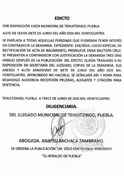 NOTA: para su publicación por TRES VECES consecutivas en el periódico el “EL HERALDO DE PUEBLA”