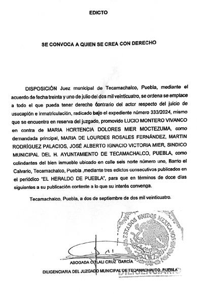 Disposición Judicial de fecha once de septiembre del dos mil veinticuatro, Juez Familiar de Acatlán de Osorio, Puebla. Expediente 478/2024, juicio SUCESORIO INTESTAMENTARIO, Promueve GLORIA HELADIA GONZALEZ AGUILAR, a bienes del de CUJUS BERNABE GONZALEZ AGUILAR, quien fue originario de Tehuitzingo con domicilio conocido en calle sin nombre, sin número, calle de Jahuey, Atopoltitlan, Tehuitzingo, Puebla; se convoca A TODO AQUEL QUE SE CREA CON DERECHO a los bienes que corresponden a la presente sucesión, para que comparezcan a deducir sus derechos a la herencia dentro del término de diez días, que se contara a partir del día hábil siguiente a la publicación Apercibimientos legales, copias traslado y auto admisorio a su disposición en secretaria civil del C. DILIGENCIARÍA LIC. LUCIA ROMAN PEREZ Para su publicación en el periódico “HERALDO DE PUEBLA”.