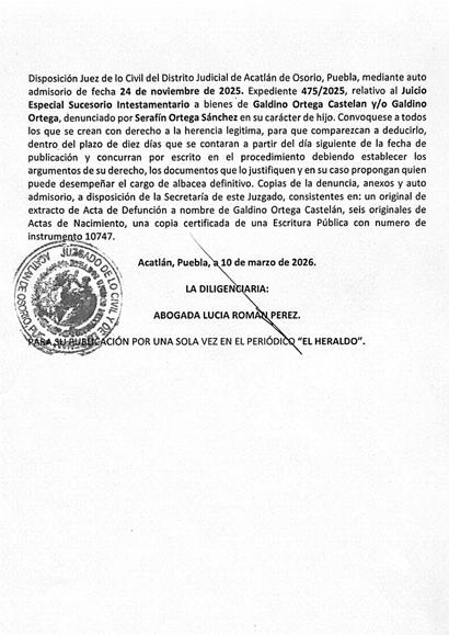 Por Disposicion del C. Juez de lo Civil del Distrito Judicial de Acatlan de Osorio Puebla de fecha veintitrés de febrero de dos mil veintiséis, se emplaza a toda persona que se crea con derecho a fin que contesten demanda de usucapión, promovida por SILVIA TECUAPACHO SANDOVAL, en el término de doce días partiendo del día siguiente a la última publicación apercibidas que de no hacerlo la totalidad de notificaciones se hará por estrados en el Juzgado que se actúa, en rebeldía y se tendrá por contestada èsta demanda en sentido negativo, la misma demanda se relaciona con la parte de solar ubicado en la calle Cuitlahuac Número 41, antes sin número, del Barrio de San Gabriel, de èsta Ciudad de Acatlán de Osorio Puebla, misma que se identifica con las medidas y colindancias siguientes: al norte en línea recta mide diecisiete metros, con cincuenta centímetros, y colinda con propiedad de MARTIMIANO DOMINGUEZ COHETERO Y/O MARTIMIANO DOMINGUEZ, al sur en línea recta mide diecisiete metros con cincuenta centímetros y colinda con propiedad de CECILIA TRUJILLO REYES antes con propiedad de GUADALUPE DOMINGUEZ; al oriente en línea recta, mide seis metros y colinda con la calle Cuitlahuac; y al poniente en línea recta mide seis metros y colinda con propiedad de MARTIMIANO DOMINGUEZ COHETERO Y/O MARTIMIANO DOMINGUEZ, las copias de traslado constan en la Secretaria del Juzgado Actuante. ACATLAN DE OSORIO PUEBLA, A DIEZ DE MARZO DEL AÑO DOS MIL VEINTISÉIS LA DILIGENCIARÍA ABOGADA LUCIA ROMÁN PÉREZ NOTA: PARA SU PUBLICACION POR TRES DIAS HABILES CONSECUTIVAS EN EL PERIÓDICO “EL HERALDO DE PUEBLA”.