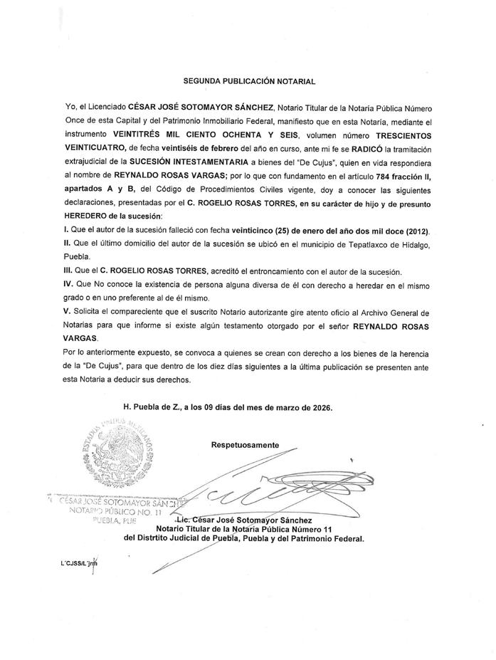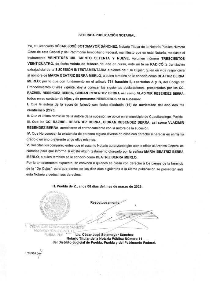 DISPOSICIÓN DEL JUEZ MUNICIPAL DE PETLALCINGO, PUEBLA; expediente 116/2026, Juicio Especial de Rectificación de Acta de Nacimiento; a efecto de que se asiente correctamente: mí nombre: TERESA VARGAS CAMPOS, fecha de nacimiento VEINTIOCHO DE OCTUBRE DE MIL NOVECIENTOS CINCUENTA Y OCHO, lugar de nacimiento PIAXTLA, PUEBLA; como nombre correcto del padre GILDARDO VARGAS GARCÍA, como nombre correcto de mi madre OLIVA CAMPOS MORÁN, presentada VIVA, fecha de registro 28 VEINTIOCHO DE OCTUBRE DE 1958 MIL NOVECIENTOS CINCUENTA Y OCHO, número de acta 145 CIENTO CUARENTA Y CINCO y COMO VÁLIDA MI ACTA DE NACIMIENTO. Auto de fecha veinte de febrero de dos mil veintiséis, emplácesele mediante EDICTO a toda persona que pudiera tener interés en contradecir demanda para que comparezca en termino de tres días para hacer valer su derecho, de no hacerlo se tendrá por perdido su derecho, quedando en Secretaria del Juzgado copias de la demanda, anexos y auto de admisión para que se impongan de la misma. Petlalcingo, Puebla; a 3 de marzo de 2026.