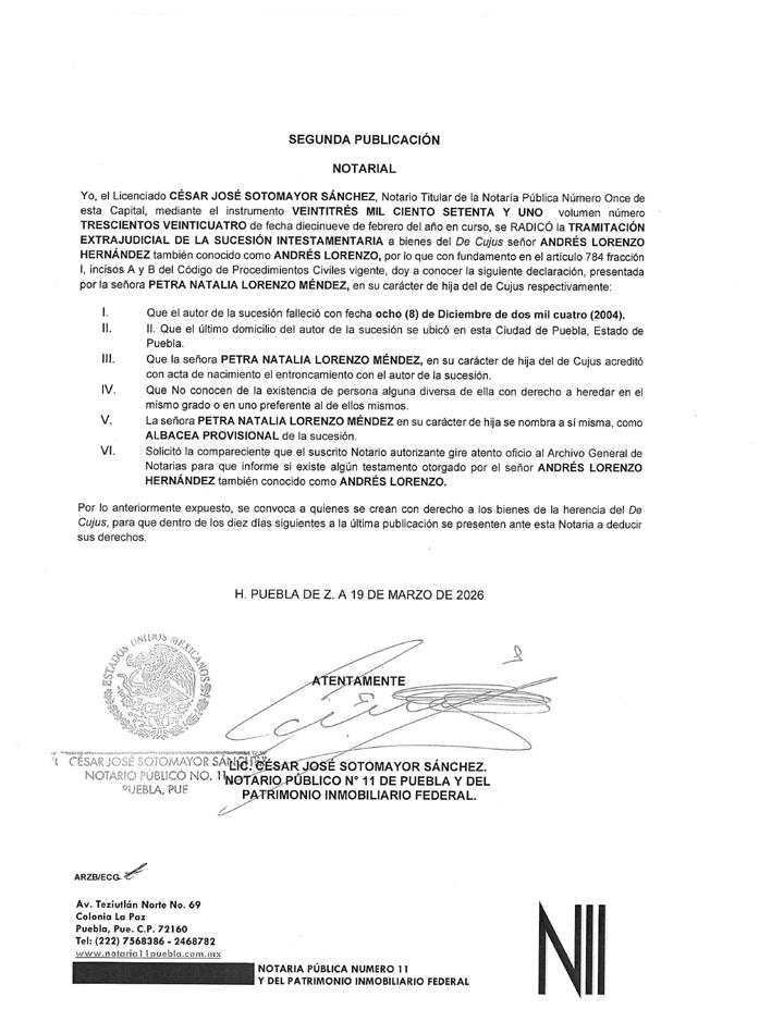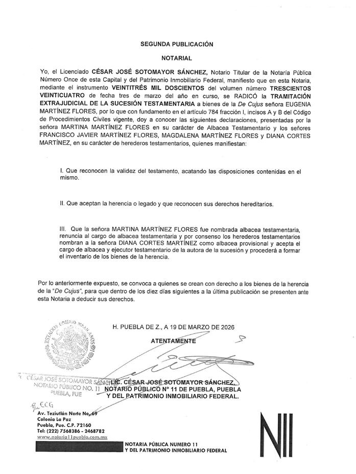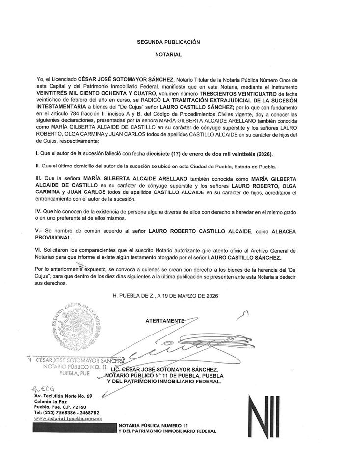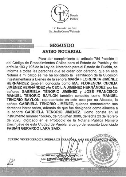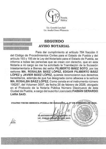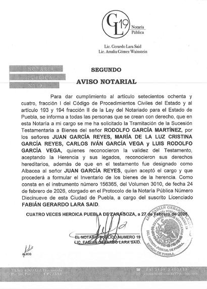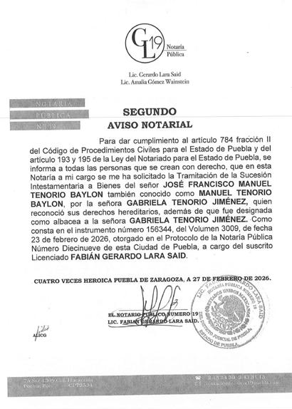 AVISO NOTARIAL DE CONFORMIDAD CON EL ARTICULO 784 DEL CÓDIGO DE PROCEDIMIENTOS CIVILES PARA EL ESTADO, EL SUSCRITO TITULAR DE LA NOTARÍA PÚBLICA NÚMERO SIETE DEL DISTRITO JUDICIAL DE TEHUACÁN, PUEBLA, DOY A CONOCER LA DENUNCIA DE LA SUCESIÓN TESTAMENTARIA DEL SEÑOR VÍCTOR MANUEL DEL VILLAR DE LUNA, QUIEN TAMBIÉN FUE CONOCIDO CON EL NOMBRE DE VÍCTOR MANUEL DEL VILLAR, QUE FORMULAN LOS SEÑORES VÍCTOR MANUEL DEL VILLAR LLEDIAS, MARÍA ALICIA DEL VILLAR LLEDIAS Y ROBERTO DEL VILLAR LLEDIAS, TODOS EN SU CARÁCTER DE HEREDEROS SUSTITUTOS INSTITUIDOS, EN LA QUE SE RECONOCEN: A).- LA VALIDEZ DEL TESTAMENTO. B).- LA ACEPTACIÓN DE LA HERENCIA QUE LEGALMENTE LES CORRESPONDE A LOS SEÑORES VÍCTOR MANUEL DEL VILLAR LLEDIAS, MARÍA ALICIA DEL VILLAR LLEDIAS Y ROBERTO DEL VILLAR LLEDIAS COMO HEREDEROS SUSTITUTOS. C).- LOS DERECHOS HEREDITARIOS DE ESTA SUCESIÓN A FAVOR DE LOS ANTES MENCIONADOS. D).- LA DESIGNACIÓN DE ALBACEA QUE RECAYÓ EN EL SEÑOR VÍCTOR MANUEL DEL VILLAR LLEDIAS, POR DESIGNACIÓN DE TODOS LOS HEREDEROS Y EN ATENCIÓN A QUE LA ALBACEA INSTITUIDA FALLECIÓ ANTES QUE EL AUTOR DE LA HERENCIA. E).- QUE EN SU OPORTUNIDAD EL ALBACEA, PROCEDERÁ A FORMULAR EL INVENTARIO DE LOS BIENES DE LA HERENCIA. ATENTAMENTE SUFRAGIO EFECTIVO NO REELECCIÓN. TEHUACÁN, PUEBLA, A 17 DE MARZO DE 2026 TITULAR DE LA NOTARIA PÚBLICA NUMERO SIETE. LIC. JOSÉ LUIS SALGADO VÁZQUEZ. Para su publicación por dos veces en un término de diez días en el Periódico “El Heraldo de Puebla”.