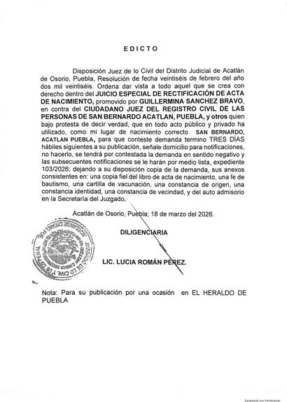 SESENTA Y CINCO, lugar de nacimiento PETLACINGO, PUEBLA; como nombre correcto del padre PEDRO TOBÓN SARABIA, como nombre correcto de mi madre ELOISA CORDERO BARRAGÁN, presentado VIVO, fecha de registro 27 VEINTISIETE DE ABRIL DE 1966 MIL NOVECIENTOS SESENTA Y SEIS, número de acta 87 OCHENTA Y SIETE y COMO VÁLIDA MI ACTA DE NACIMIENTO. Auto de fecha veinte de febrero de dos mil veintiséis, emplácesele mediante EDICTO a toda persona que pudiera tener interés en contradecir demanda para que comparezca en termino de tres días para hacer valer su derecho, de no hacerlo se tendrá por perdido su derecho, quedando en Secretaria del Juzgado copias de la demanda, anexos y auto de admisión para que se impongan de la misma. Petlalcingo, Puebla; a 3 de marzo de 2026. ABOGADA ERIKA ROSALBA HERNÁNDEZ SARABIA DILIGENCIARIA DEL JUZGADO MUNICIPAL DE PETLALCINGO, PUEBLA.