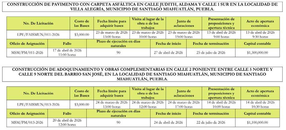 Las bases de la licitación se encuentran disponibles para consulta y venta en: Domicilio Conocido SN, Colonia Sin Colonia, Santiago Miahuatlán perteneciente al Municipio de Santiago Miahuatlán, Puebla. Teléfono 238 371 06 01 en un horario de 9:00 a 15:00 horas. La forma de pago es: en efectivo.