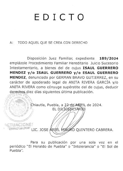 DISPOSICIÓN JUDICIAL. Juez Civil de Acatlán, Puebla, resolución 9 enero 2024, ordena emplazar TODO AQUEL QUE SE CREA CON DERECHO al PREDIO URBANO CON CONSTRUCCION PARA HABITACION UBICADO EN PRIVADA CINCO DE FEBRERO SIN NUMERO, SECCION SEGUNDA DE CHINANTLA, PUEBLA; siguientes medidas y colindancias: norte, 32.49 metros en dos tramos con Miguel Chino Leyva; sur, en línea quebrada de ocho tramos, 33.74 metros con Paula Ángel y Tila Pantaleón; este, 14.10 metros con Privada Cinco de Febrero; oeste, 17.20 metros con Rosalino Chino Pantaleón. Comparezcan contestar demanda término DOCE DÍAS siguientes última publicación, no hacerlo tendráse contestada negativamente y en rebeldía. Juicio Usucapión e inmatriculación, expediente 6/2024, promueve ENEDINA CARRADA PEREZ. Copias traslado y anexos, Secretaría. Acatlán, Puebla, 9 enero 2024 LA DILIGENCIARIA
