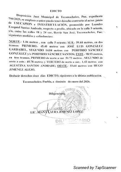 EDICTO A TODO INTERESADO: Por disposición del Juzgado Municipal de Tecamachalco, Puebla, dentro del expediente número 742/2025, relativo al juicio de Usucapión promovido por ISIDRO PÉREZ MALDONADO, en contra de BARTOLO PÉREZ, colindantes ELÍAS PÉREZ ANDRADE, AURELIANO PÉREZ PÉREZ, NARCISO PÉREZ ANDRADE y Síndico Municipal del Honorable Ayuntamiento Municipal de Tecamachalco, Puebla, y todo aquel que se crea con derecho contrario a las pretensiones del actor, respecto del “PREDIO UBICADO EN EL PUEBLO DE ALSESECA, DE ESTA CIUDAD DE TECAMACHALCO, PUEBLA, ACTUALMENTE UBICADO EN CALLE MAXIMINO ÁVILA CAMACHO, LOCALIDAD DE SANTIAGO ALSESECA, MUNICIPIO DE TECAMACHALCO, PUEBLA”, inmueble que cuenta con las siguientes medidas y colindancias siguientes, AL NORTE. MIDE SIETE METROS VEINTE CENTÍMETROS, COLINDA CON ELIAS PÉREZ ANDRADE; AL SUR. MIDE SIETE METROS VEINTE CENTÍMETROS, COLINDA CON AVENIDA MAXIMINO ÁVILA CAMACHO; AL ORIENTE. VEINTIDÓS METROS OCHENTA CENTÍMETROS, COLINDA CON AURELIANO PÉREZ PÉREZ Y AL PONIENTE. MIDE VEINTIDÓS METROS CINCUENTA CENTÍMETROS, COLINDA CON NARCISO PÉREZ ANDRADE, PREDIO CON UNA SUPERFICIE DE CIENTO SESENTA Y DOS METROS CUADRADOS, para que en un termino de doce días posteriores a la última publicación comparezcan a juicio a deducir sus derechos, apercibiéndolos de que en caso de no hacerlo en el término señalado se les tendrá por contestada la demanda en sentido negativo y las siguientes notificaciones, incluyendo las personales, se les harán por lista en los estrados de este Juzgado Municipal de Tecamachalco, Puebla, en términos de ley. Tecamachalco, Puebla a catorce de enero de dos mil veintiséis. DILIGENCIARIO LICENCIADA DIANA LAURA JIMÉNEZ LÓPEZ