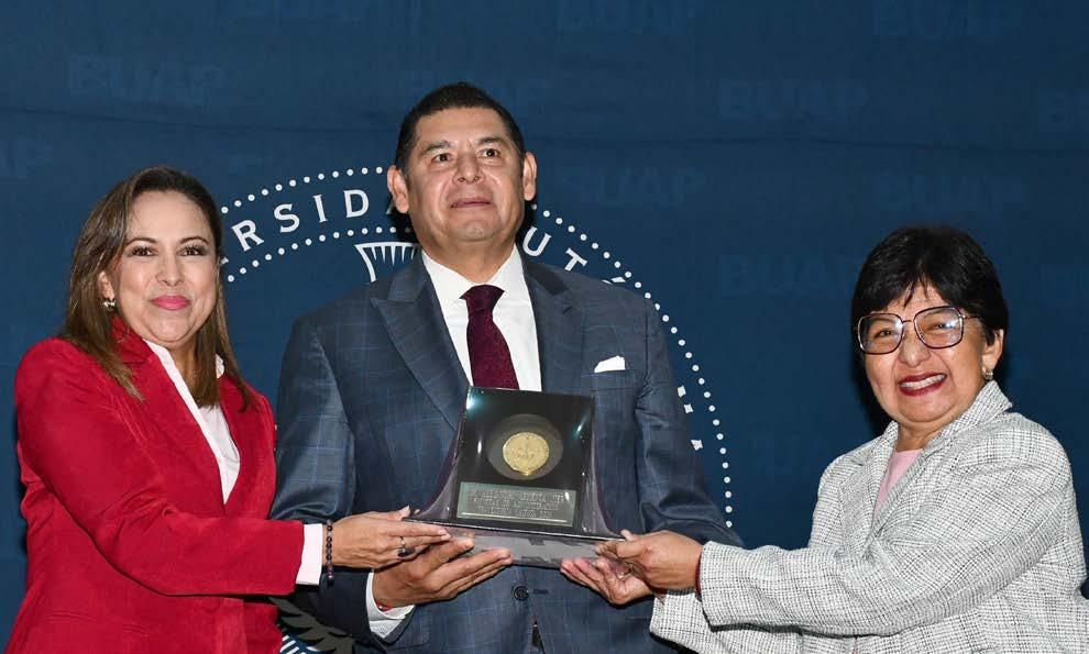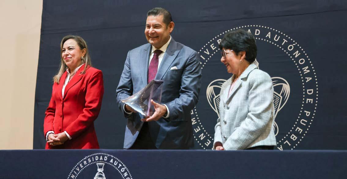 LA RECTORA DE LA BUAP, LILIA CEDILLO, ENTREGÓ UN RECONOCIMIENTO AL GOBERNADOR ALEJANDRO ARMENTA COMO EXALUMNO DESTACADO, EN EL MARCO DEL 67 ANIVERSARIO DE LA FACULTAD DE ADMINISTRACIÓN, Y RESALTÓ SU APOYO A LA EDUCACIÓN. ALBERTO ARCEGA | FOTO: ESPECIAL | PÁG.8