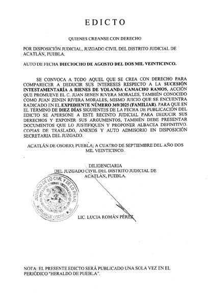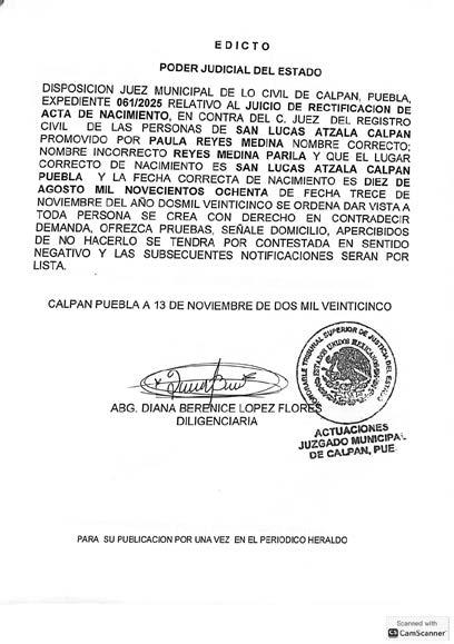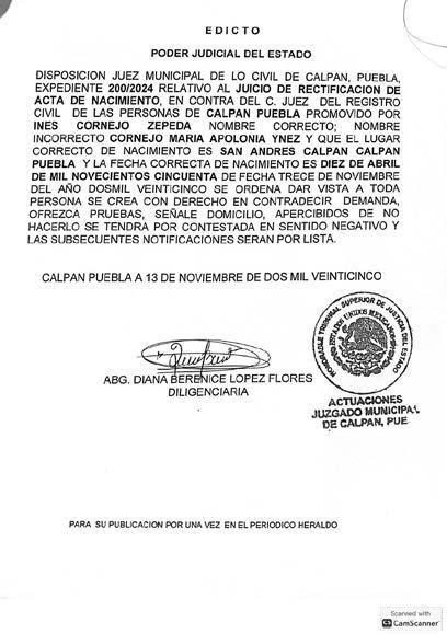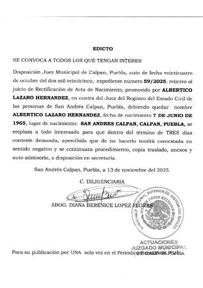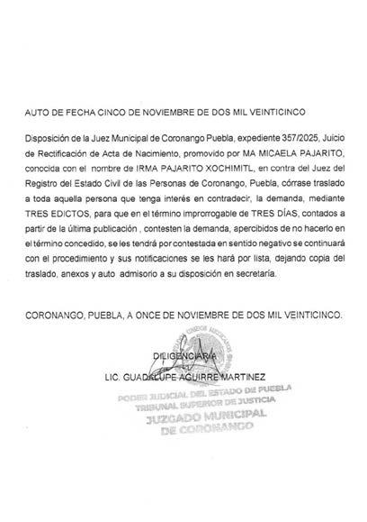 AUTO DE FECHA TREINTA DE OCTUBRE DE DOS MIL VENTICINCO. Disposición de la Juez Municipal de Coronango Puebla, expediente 354/2025, Juicio de Rectificación de Acta de Nacimiento, promovido por JUVENTINA GARCÍA GARCÍA, en contra del Juez del Registro del Estado Civil de las Personas de Coronango Puebla, córrase traslado a toda aquellas persona que tenga interés en contradecir la demanda, mediante TRES EDICTOS, para que dentro del término improrrogable de TRES DIAS, contados a partir de la última publicación, contesten la demande, apercibidos de no hacerlo en el término concedido, se les tendrá por contestada en sentido negativo se continuare con el procedimiento y sus notificaciones se les hará por lista, dejando copia de traslado, anexos y auto aclaratorio a su disposición en secretaria. CORONANGO, PUEBLA A DIEZ DE NOVIEMBRE DE DOS MIL VEINTICINCO. LIC, GUADALUPE AGUIRRE MARTINEZ. DILIGENCIARIA.
