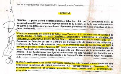 En este documento se señalan diversos pagos realizados, los montos, los nombres, se acreditan los incumplimientos del afiliado patronato del sistema de futbol de Veracruz AC. Al final la Comisión de controversias resuelve, dando la razón de manera absoluta a Mohamed Morales porque acredito plenamente con pruebas sus dichos y lo más importante condena al afiliado Patronato del Sistema para el futbol de Veracruz, que le pague al empresario un total de 37 millones, 254 mil setecientos cincuenta pesos.