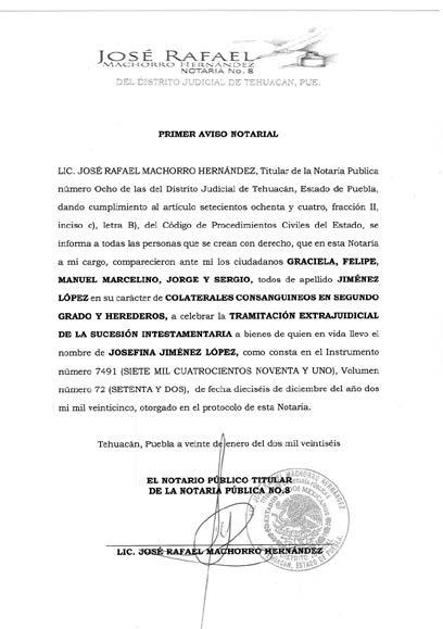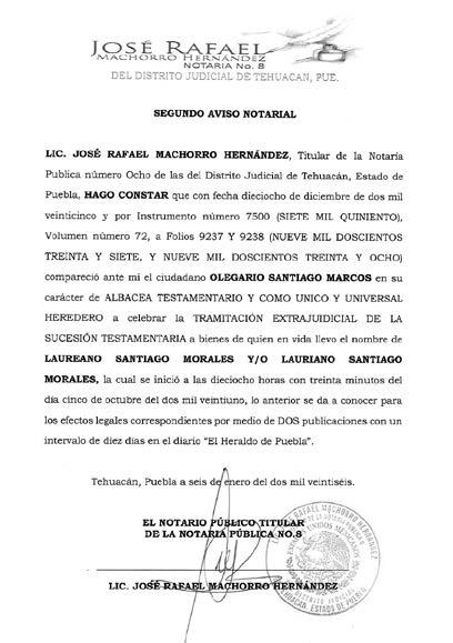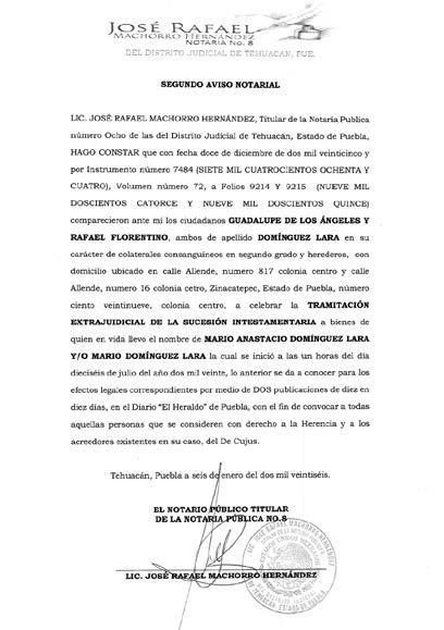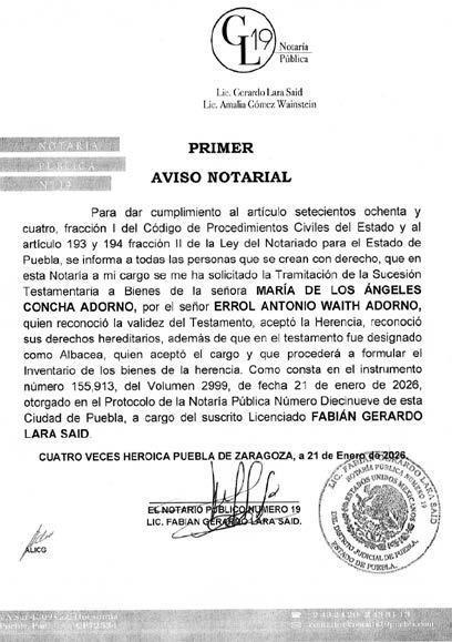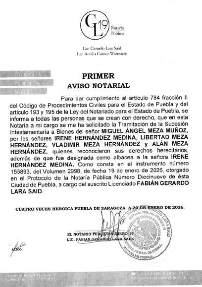 Disposición Judicial de fecha veintiocho de noviembre del año dos mil veinticinco, Juez de lo Civil de Acatlán Puebla; Expediente 59372025; Juicio Sucesorio Intestamentario; convóquense todas personas créanse con derecho a bienes sucesión intestamentaria GUILLERMINA TAPIA GONZALEZ, ÚLTIMO DOMICILIO EN Calle Cuitláhuac número Treinta y Cuatro Barrio de San Gabriel, Municipio de Acatlán, Estado de Puebla; presentarse al juzgado a deducir derechos, término diez días siguientes única publicación. Concurran por escrito, debiendo establecer los argumentos de su derecho, los documentos que lo justifiquen y proponga a quien puede desempeñar el cargo de Albacea Definitivo; promueve MARIANA COHETERO TAPIA por propio derecho y como apoderado legal de DANIEL GONZALO COHETERO MARTINEZ. Disposición copias demanda, auto admisorio y documentos fundatorios en la Secretaría del Juzgado. Anexos: Un formato de defunción, un acta de matrimonio electrónica, una copia certificada de un acto notarial # 156, una copia certificada de acta de matrimonio, una copia notariada de instrumento #10215, Un Avalúo, copia simple de documentos, un traslado. Acatlán de Osorio, Puebla; a dieciséis de diciembre de dos mil veinticinco. C. LA DILIGENCIARIA LIC. LUCIA ROMAN PEREZ Para su publicación por una sola vez en el Periódico “El Heraldo de Puebla”