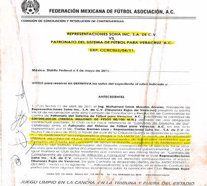 Ante la FMF, se vinculó un convenio que acreditaba que el patronato debía proporcionarle de manera anual a la empresa de Mohamed Morales, treinta millones de pesos para pagar los gastos de operación del primer equipo del Veracruz. Estos pagos dejaron de realizarle, el empresario empieza a hacerles frente hasta que NO puede más y lleva ante la comisión de controversias de la FMF su reclamo del pago incumplido.