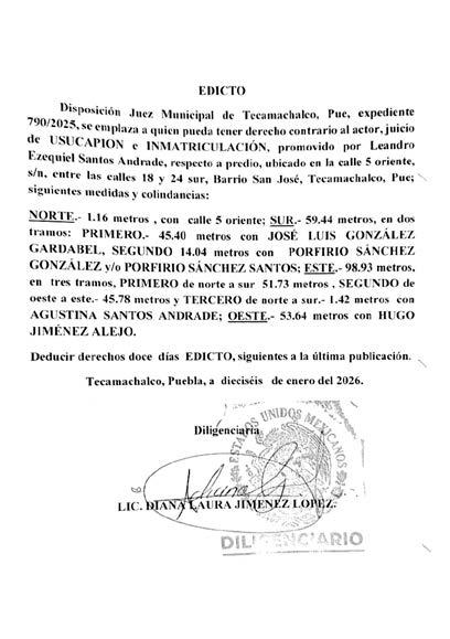 Por disposición del Juzgado Municipal de Tecamachalco, Puebla, dentro del expediente número 742/2025, relativo al juicio de Usucapión promovido por ISIDRO PÉREZ MALDONADO, en contra de BARTOLO PÉREZ, colindantes ELÍAS PÉREZ ANDRADE, AURELIANO PÉREZ PÉREZ, NARCISO PÉREZ ANDRADE y Síndico Municipal del Honorable Ayuntamiento Municipal de Tecamachalco, Puebla, y todo aquel que se crea con derecho contrario a las pretensiones del actor, respecto del “PREDIO UBICADO EN EL PUEBLO DE ALSESECA, DE ESTA CIUDAD DE TECAMACHALCO, PUEBLA, ACTUALMENTE UBICADO EN CALLE MAXIMINO ÁVILA CAMACHO, LOCALIDAD DE SANTIAGO ALSESECA, MUNICIPIO DE TECAMACHALCO, PUEBLA”, inmueble que cuenta con las siguientes medidas y colindancias siguientes, AL NORTE. MIDE SIETE METROS VEINTE CENTÍMETROS, COLINDA CON ELIAS PÉREZ ANDRADE; AL SUR. MIDE SIETE METROS VEINTE CENTÍMETROS, COLINDA CON AVENIDA MAXIMINO ÁVILA CAMACHO; AL ORIENTE. VEINTIDÓS METROS OCHENTA CENTÍMETROS, COLINDA CON AURELIANO PÉREZ PÉREZ Y AL PONIENTE. MIDE VEINTIDÓS METROS CINCUENTA CENTÍMETROS, COLINDA CON NARCISO PÉREZ ANDRADE, PREDIO CON UNA SUPERFICIE DE CIENTO SESENTA Y DOS METROS CUADRADOS, para que en un termino de doce días posteriores a la última publicación comparezcan a juicio a deducir sus derechos, apercibiéndolos de que en caso de no hacerlo en el término señalado se les tendrá por contestada la demanda en sentido negativo y las siguientes notificaciones, incluyendo las personales, se les harán por lista en los estrados de este Juzgado Municipal de Tecamachalco, Puebla, en términos de ley. Tecamachalco, Puebla a catorce de enero de dos mil veintiséis. DILIGENCIARIO LICENCIADA DIANA LAURA JIMÉNEZ LÓPEZ
