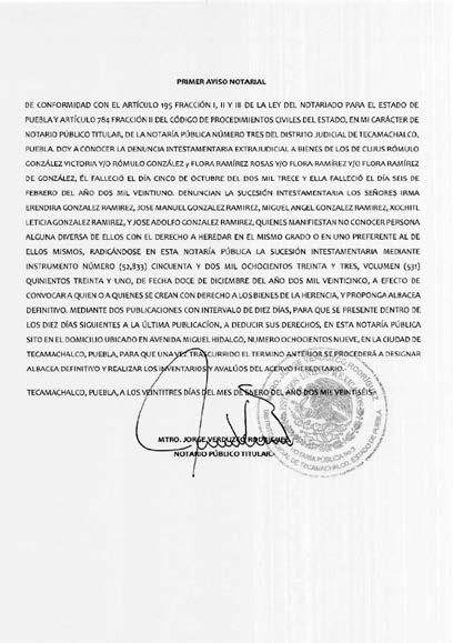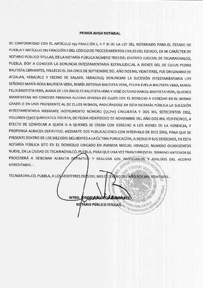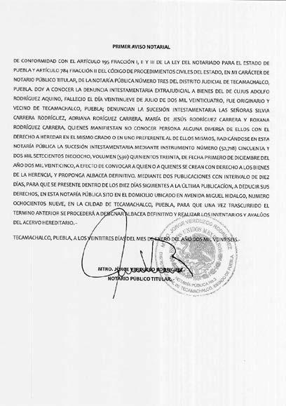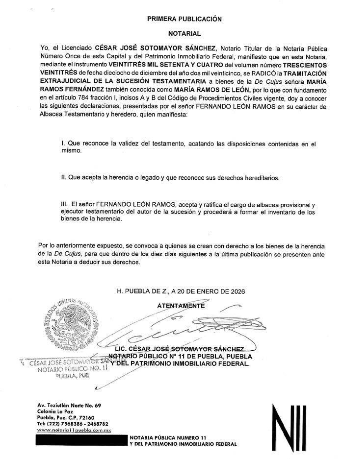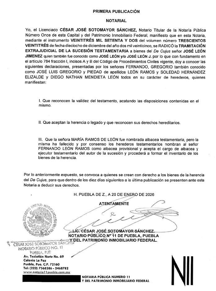 Por disposición del Juzgado Municipal de Tecamachalco, Puebla, dentro del expediente número 742/2025, relativo al juicio de Usucapión promovido por ISIDRO PÉREZ MALDONADO, en contra de BARTOLO PÉREZ, colindantes ELÍAS PÉREZ ANDRADE, AURELIANO PÉREZ PÉREZ, NARCISO PÉREZ ANDRADE y Síndico Municipal del Honorable Ayuntamiento Municipal de Tecamachalco, Puebla, y todo aquel que se crea con derecho contrario a las pretensiones del actor, respecto del “PREDIO UBICADO EN EL PUEBLO DE ALSESECA, DE ESTA CIUDAD DE TECAMACHALCO, PUEBLA, ACTUALMENTE UBICADO EN CALLE MAXIMINO ÁVILA CAMACHO, LOCALIDAD DE SANTIAGO ALSESECA, MUNICIPIO DE TECAMACHALCO, PUEBLA”, inmueble que cuenta con las siguientes medidas y colindancias siguientes, AL NORTE. MIDE SIETE METROS VEINTE CENTÍMETROS, COLINDA CON ELIAS PÉREZ ANDRADE; AL SUR. MIDE SIETE METROS VEINTE CENTÍMETROS, COLINDA CON AVENIDA MAXIMINO ÁVILA CAMACHO; AL ORIENTE. VEINTIDÓS METROS OCHENTA CENTÍMETROS, COLINDA CON AURELIANO PÉREZ PÉREZ Y AL PONIENTE. MIDE VEINTIDÓS METROS CINCUENTA CENTÍMETROS, COLINDA CON NARCISO PÉREZ ANDRADE, PREDIO CON UNA SUPERFICIE DE CIENTO SESENTA Y DOS METROS CUADRADOS, para que en un termino de doce días posteriores a la última publicación comparezcan a juicio a deducir sus derechos, apercibiéndolos de que en caso de no hacerlo en el término señalado se les tendrá por contestada la demanda en sentido negativo y las siguientes notificaciones, incluyendo las personales, se les harán por lista en los estrados de este Juzgado Municipal de Tecamachalco, Puebla, en términos de ley. Tecamachalco, Puebla a catorce de enero de dos mil veintiséis. DILIGENCIARIO LICENCIADA DIANA LAURA JIMÉNEZ LÓPEZ