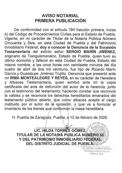 NOTARIAL DE CONFORMIDAD CON EL ARTICULO 784 DEL CÓDIGO DE PROCEDIMIENTOS CIVILES PARA EL ESTADO, EL SUSCRITO TITULAR DE LA NOTARÍA PÚBLICA NÚMERO SIETE DEL DISTRITO JUDICIAL DE TEHUACÁN, PUEBLA, DOY A CONOCER QUE EN LA NOTARÍA DE LA CUAL SOY TITULAR, A TRAVÉS DEL INSTRUMENTO PÚBLICO NÚMERO 16865 DEL VOLUMEN 254 DE FECHA 18 DE FEBRERO DEL AÑO EN CURSO, SE LLEVÓ A CABO EL INICIO DE LA TRAMITACIÓN EXTRAJUDICIAL DE LA SUCESIÓN INTESTAMENTARIA A BIENES DE LA SEÑORA MARÍA DOLORES ALARCON JAIME, QUIEN TAMBIÉN FUE CONOCIDA COMO DOLORES ALARCON y/o DOLORES ALARCON DE TOBÓN, QUE FORMULAN RICARDO TOBÓN ALARCON, ENRIQUE TOBÓN ALARCON y MARGARITA TOBÓN ALARCON, EN SU CARÁCTER DE HERMANOS CONSANGUÍNEOS DE LA AUTORA DE LA SUCESIÓN, RECONOCIENDO: A).- QUE LOS COMPARECIENTES NO CONOCEN DE LA EXISTENCIA DE PERSONA ALGUNA DIVERSA DE ELLOS CON DERECHO A HEREDAR EN EL MISMO GRADO O EN UNO PREFERENTE AL DE ELLOS MISMOS. B).- LOS DERECHOS HEREDITARIOS DE ESTA SUCESIÓN. C).- QUE EN VIRTUD DEL INFORME EXPEDIDO POR LA DIRECCIÓN DEL ARCHIVO DE NOTARIAS DE ESTADO DE PUEBLA CON NUMERO DE OFICIO CJGE-DGN-DAN-VD-0269/2026, NO SE ENCONTRÓ DISPOSICIÓN TESTAMENTARIA ALGUNA HECHA POR EL EXTINTO. LO ANTERIOR A EFECTO DE CONVOCAR A QUIEN O QUIENES SE CREAN CON DERECHO A LOS BIENES DE LA HERENCIA, PARA QUE SE PRESENTEN DENTRO DE LOS DIEZ DÍAS SIGUIENTES AL DE LA ÚLTIMA PUBLICACIÓN, A DEDUCIR SUS DERECHOS. ATENTAMENTE SUFRAGIO EFECTIVO NO REELECCIÓN. TEHUACÁN, PUEBLA, A LOS 18 DÍAS DEL MES DE FEBRERO DE 2026 TITULAR DE LA NOTARIA PÚBLICA NUMERO SIETE. LIC. JOSÉ LUIS SALGADO VÁZQUEZ. Para su publicación por dos veces en un término de diez días en el Periódico “El Heraldo de Puebla”.
