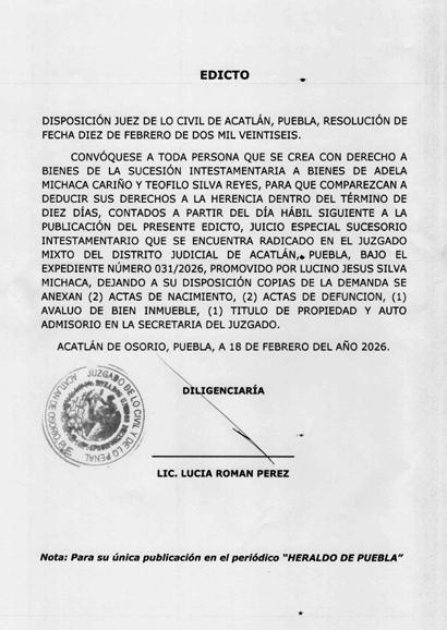 Disposición de la Juez Municipal de Coronango, Puebla, por auto de fecha doce de febrero de dos mil veintiséis, dentro del expediente número 52/2026, juicio de rectificación de acta de nacimiento promovido por MICAELA MIHUALTECATL CARRETERO, en contra del Juez del Registro Civil de las Personas de Coronango, Puebla, córrase traslado a toda aquella persona que tengan interés en contradecir la demanda, mediante EL EDICTO, para que dentro del término improrrogable de TRES DÍAS contados a partir de la última publicación contesten la demanda, apercibidos de no hacerlo en el término concedido, se les tendrá por contestada en sentido negativo se continuara con el procedimiento y sus notificaciones se les hará por lista, dejando copia de traslado, anexos y auto admisorio a su disposición en secretaria.