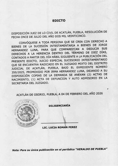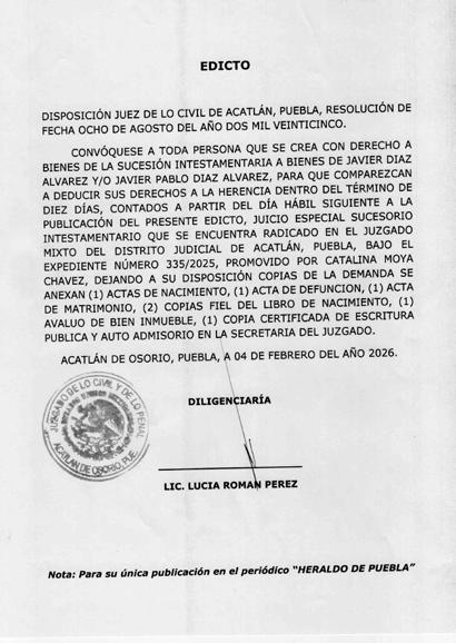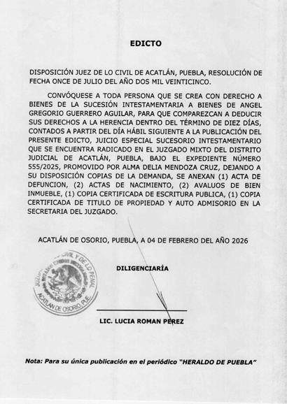 Disposición de la Juez Municipal de Coronango, Puebla, por auto de fecha doce de febrero de dos mil veintiséis, dentro del expediente número 53/2026, juicio de rectificación de acta de nacimiento promovido por BARTOLOME AMASTAL MENDEZ, en contra del Juez del Registro Civil de las Personas de Coronango, Puebla, córrase traslado a toda aquella persona que tengan interés en contradecir la demanda, mediante EL EDICTO, para que dentro del término improrrogable de TRES DÍAS contados a partir de la última publicación contesten la demanda, apercibidos de no hacerlo en el término concedido, se les tendrá por contestada en sentido negativo se continuara con el procedimiento y sus notificaciones se les hará por lista, dejando copia de traslado, anexos y auto admisorio a su disposición en secretaria.