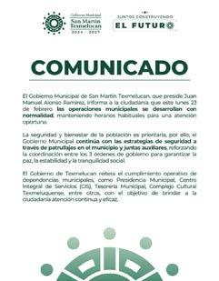 REDACCIÓN. El Gobierno Municipal de San Martín Texmelucan, que preside Juan Manuel Alonso Ramírez, informa a la ciudadanía que este lunes 23 de febrero las operaciones municipales se desarrollan con normalidad, manteniendo horarios habituales para una atención oportuna. FOTO: ESPECIAL