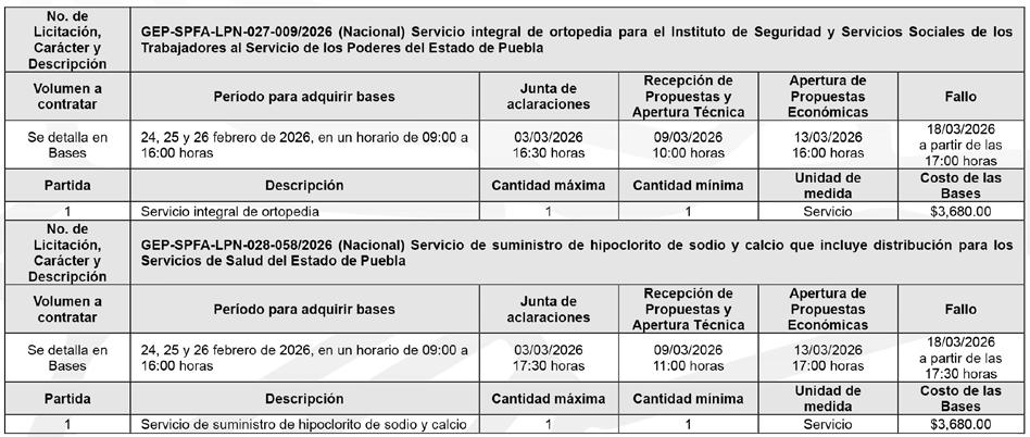 La Secretaría de Planeación, Finanzas y Administración del Gobierno del Estado de Puebla, a través de la Dirección de Adquisiciones de Bienes y Servicios, en observancia del artículo 134 de la Constitución Política de los Estados Unidos Mexicanos, artículo 108 de la Constitución Política del Estado Libre y Soberano de Puebla; así como los artículos 15 fracción I, 16, 78, 79, 82 segundo párrafo,108 y demás que resulten aplicables de la Ley de Adquisiciones, Arrendamientos y Servicios del Sector Público Estatal y Municipal; artículo 47 de la Ley de Egresos del Estado de Puebla para el ejercicio fiscal 2026, 33 fracción LXXV de la Ley Orgánica de la Administración Pública del Estado de Puebla; y artículos 5 fracción VI, inciso c), 9, 13 fracción III y 68 fracciones II y III del Reglamento Interior de la Secretaría de Planeación, Finanzas y Administración del Gobierno del Estado de Puebla, convoca a los interesados a presentar libremente propuestas solventes en idioma español en sobre cerrado, a las personas físicas o morales, de nacionalidad mexicana, en las licitaciones públicas, cuyas bases contienen los requisitos de participación. Los interesados podrán revisar las bases previamente a su pago, el cual será requisito para participar en las licitaciones, en www.licitaciones.puebla.gob.mx y en la Dirección de Adquisiciones de Bienes y Servicios, en el tiempo establecido en los procedimientos.