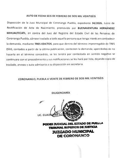 AUTO DE FECHA TRES DE FEBRERO DE DOS MIL VEINTISEIS Disposición de la Ciudadana Jueza Municipal de Coronango, Puebla, expediente 27/2026, Juicio de Rectificación de acta de Nacimiento, promovido por MARIA NIEVES CUAUTLAYOTL ROSALES, en contra del C Juez del Registro Civil de las personas de Coronango, Puebla, córrase traslado a toda aquella persona que tenga interés en contradecir la demanda, mediante la publicación DE LOS EDICTOS, para que dentro del término improrrogable de TRES DIAS, contados a partir de la última publicación, contesten la demanda, apercibidos que de no hacerlo dentro del término concedido, se les tendrá por contestada en sentido negativo, se continuara con el procedimiento y sus notificaciones se harán por lista, dejando copia de traslado anexos y auto admisorio a su disposición en Secretaria. CORONANGO, PUEBLA, A DIEZ DE FEBRERO DE DOS MIL VEINTISEIS C. DILIGENCIARIA ABOGADA GUADALUPE AGUIRRE MARTINEZ PODER JUDICIAL DEL ESTADO DE PUEBLA TRIBUNAL SUPERIOR DE JUSTICIA JUZGADO MUNICIPAL DE CORONAMGO PARA PUBLICARSE POR TRES DIAS CONSECUTIVOS EN EL PERIODICO EL HERALDO DE PUEBLA