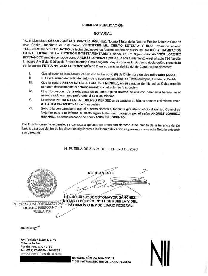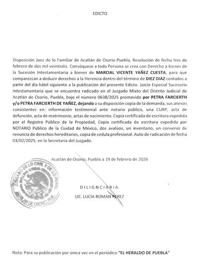 Disposición Judicial resolución emitida por el Juzgado Mixto del Distrito Judicial de Acatlán de Osorio, Puebla, con fecha TRECE DE FEBRERO DEL AÑO DOS MIL VEINTISEIS Se convoca a toda persona que se crea con derecho a los bienes correspondiente JUICIO ESPECIAL DE SUCESIÓN INTESTAMENTARIA, a bienes de BERNARDINO NAVA LEAL: comparezcan a deducir sus derecho y la herencia dentro del término de diez días hábiles siguientes a la última publicación, Promueve EVANGELINA LOPEZ BERMEJO y/o EVA LOPEZ BERMEJO, en el expediente número 56/2026, quedando copias traslados de demanda copia de escrituras publicas, actas de nacimiento inventarios y avaluos, sus anexos y auto admisorio en la secretaria del juzgado. NOTA: para su publicación por una sola vez en el periódico el HERALDO DE PUEBLA. C. LIC. LUCIA ROMAN REREZ C. Diligenciaría