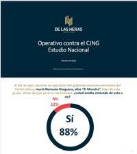 La pregunta del cuestionario fue: El día de ayer, durante un operativo del gobierno mexicano en contra del Cartel Jalisco, murió Nemesio Oseguera, alias “El Mencho”, líder de este grupo. Antes de que yo se lo mencionara, ¿usted estaba enterado de esto o no? ante lo cual la respuesta afirmativa fue contundentemente mayoritaria.