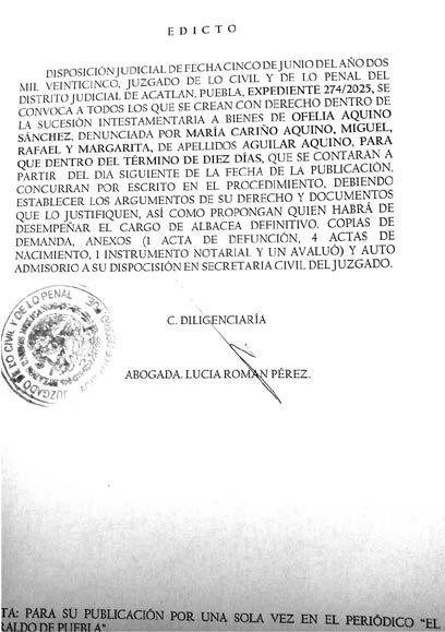 Disposición Judicial, de fecha 5 de agosto de 2025, Jueza Municipal de Acatlán de Osorio, Puebla, Expediente 415/2025, emplácese del JUICIO ESPECIAL DE RECTIFICACIÓN DE ACTA DE NACIMIENTO a todo aquel que pudiera tener interés en contradecir la demanda, promueve EUSTORGIO MAURO LEOPOLDO CORTES RAMIREZ, CONTRA EL JUEZ DEL REGISTRO DEL ESTADO CIVIL DE LAS PERSONAS DE ACATLÁN, PUEBLA, CANCELACION DE NOTACION MARGINAL Y JUICIO ESPECIAL DE RECTIFICACION Y VALIDACIÓN DE ACTA DE NACIMIENTO POR ENMIENDA, PARA CORREGIR LOS DATOS INCORRECTOS QUE APARECEN EN SU ACTA, ya que SE ASENTÓ DE MANERA ERRONEA EL AÑO DE REGISTRO, NOMBRE, FECHA DE NACIMIENTO, EL LUGAR DE NACIMIENTO; FECHA DE REGISTRO: 16 DE ENERO DE 1963; NOMBRE: EUSTORGIO MAURO LEOPOLDO CORTES RAMIREZ; FECHA DE NACIMIENTO: 11 DE ABRIL DE 1948; LUGAR DE NACIMIENTO: ACATLÁN DE OSORIO, PUEBLA. Producir contestación dentro del término de tres días siguientes a esta publicación apercibimientos legales copias Secretaria. ACATLAN DE OSORIO, PUEBLA A DIEZ DE SEPTIEMBRE DE DOS MIL VEINTICINCO LA DILIGENCIARIA ABOGADA MONSERRAT GUADALUPE TRUJILLO CISNEROS NOTA: POR UNA SOLA PUBLICACIÓN EL PERIÓDICO “EL HERALDO DE PUEBLA”