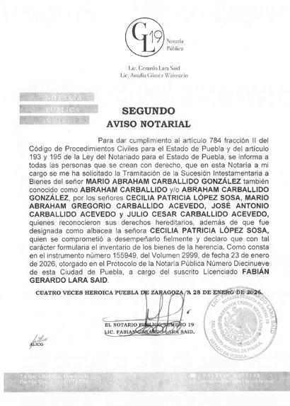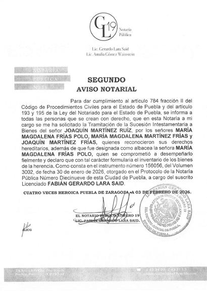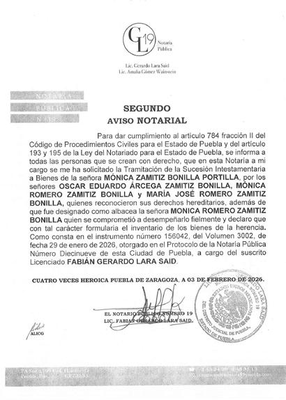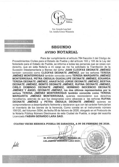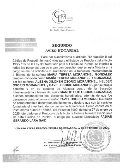 Disposición Judicial resolución emitida por el Juzgado Mixto del Distrito Judicial de Acatlán de Osorio, Puebla, con fecha TRECE DE FEBRERO DEL AÑO DOS MIL VEINTISEIS Se convoca a toda persona que se crea con derecho a los bienes correspondiente JUICIO ESPECIAL DE SUCESIÓN INTESTAMENTARIA, a bienes de BERNARDINO NAVA LEAL: comparezcan a deducir sus derecho y la herencia dentro del término de diez días hábiles siguientes a la última publicación, Promueve EVANGELINA LOPEZ BERMEJO y/o EVA LOPEZ BERMEJO, en el expediente número 56/2026, quedando copias traslados de demanda copia de escrituras publicas, actas de nacimiento inventarios y avaluos, sus anexos y auto admisorio en la secretaria del juzgado. NOTA: para su publicación por una sola vez en el periódico el HERALDO DE PUEBLA. C. LIC. LUCIA ROMAN REREZ C. Diligenciaría