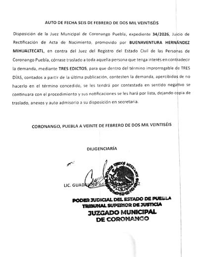 Disposición de la Ciudadana Jueza Municipal de Coronango, Puebla, expediente 14/2026, Juicio de Rectificación de acta de Nacimiento, promovido por ENRIQUETA TLAMANI XOCHIMITL, en contra dei C. Juez del Registro Civil de las personas de San Martin Zoqulapan, Municipio de Coronango, Puebla, córrase traslado a toda aquella persona que tenga interés en contradecir la demanda, mediante la publicación DE LOS EDICTOS, para que dentro del término improrrogable de TRES DIAS, contados a partir de la última publicación, contesten la demanda, apercibidos que de no hacerlo dentro del término concedido, se les tendrá por contestada en sentido negativo, se continuara con el procedimiento y sus notificaciones se harán por lista, dejando copia de traslado anexos y auto admisorio a su disposición en Secretaria CORONANGO, PUEBLA, A DIEZ DE FEBRERO DE DOS MIL VEINTISEIS