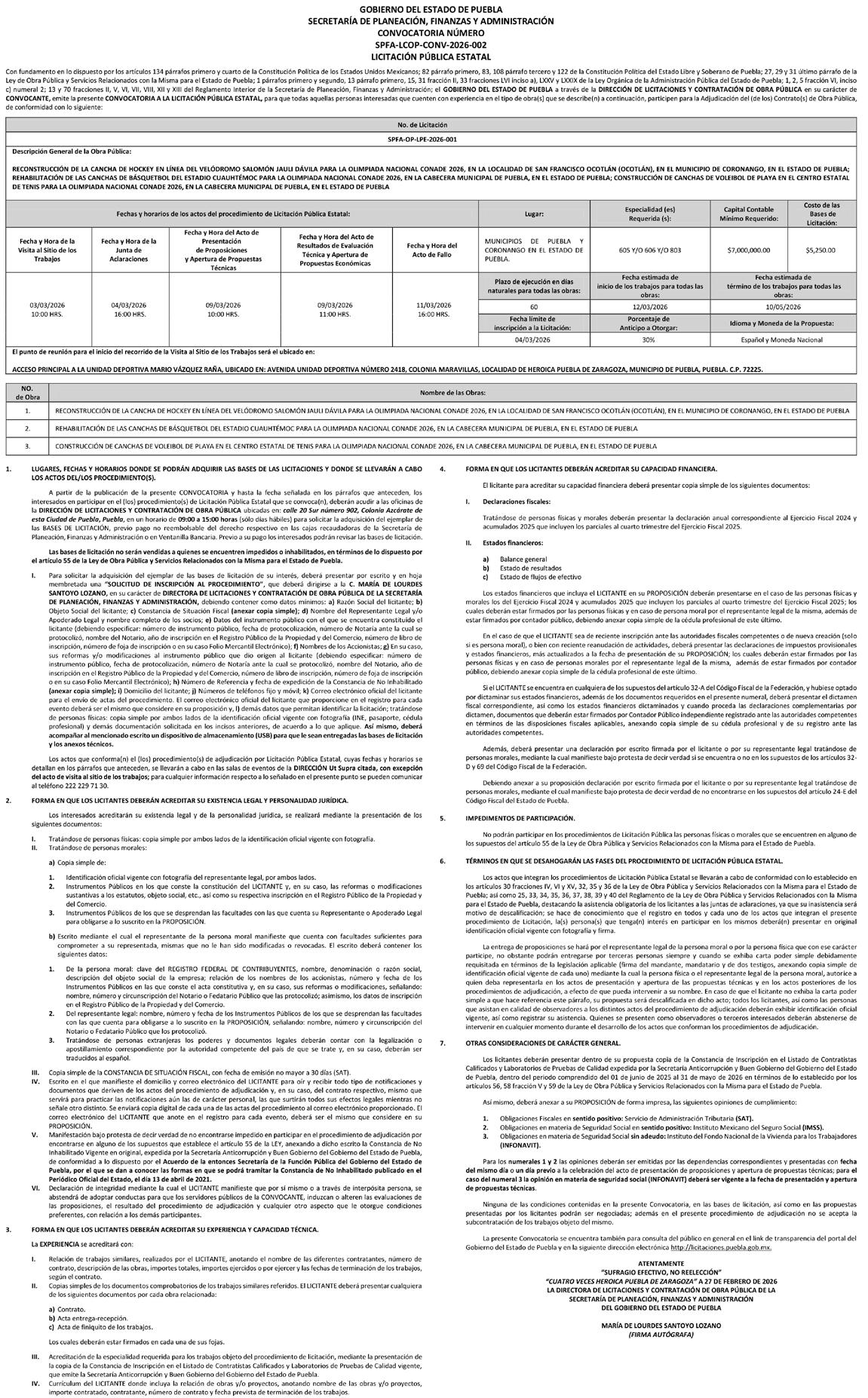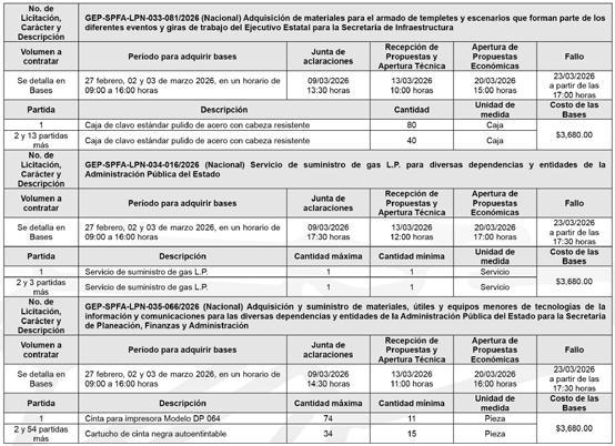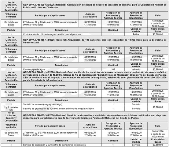 La Secretaría de Planeación, Finanzas y Administración del Gobierno del Estado de Puebla, a través de la Dirección de Adquisiciones de Bienes y Servicios, en observancia del artículo 134 de la Constitución Política de los Estados Unidos Mexicanos, artículo 108 de la Constitución Política del Estado Libre y Soberano de Puebla; así como los artículos 15 fracción I, 16, 78, 79, 82 segundo párrafo,108 y demás que resulten aplicables de la Ley de Adquisiciones, Arrendamientos y Servicios del Sector Público Estatal y Municipal; artículo 47 de la Ley de Egresos del Estado de Puebla para el ejercicio fiscal 2026, 33 fracción LXXV de la Ley Orgánica de la Administración Pública del Estado de Puebla; y artículos 5 fracción VI, inciso c), 9, 13 fracción III y 68 fracciones II y III del Reglamento Interior de la Secretaría de Planeación, Finanzas y Administración del Gobierno del Estado de Puebla, convoca a los interesados a presentar libremente propuestas solventes en idioma español en sobre cerrado, a las personas físicas o morales, de nacionalidad mexicana, en las licitaciones públicas, cuyas bases contienen los requisitos de participación. Los interesados podrán revisar las bases previamente a su pago, el cual será requisito para participar en las licitaciones, en www.licitaciones.puebla.gob.mx y en la Dirección de Adquisiciones de Bienes y Servicios, en el tiempo establecido en los procedimientos.